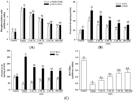 Exposure to AGEs (300 μg/mL) elicited pronounced ER stress in SH-SY5Y cells, as indicated by 3.8- and 4.1-fold increases in the ratios of phosphorylated PERK to total PERK and phosphorylated eIF2α to total eIF2α, respectively, compared to controls (p < 0.01; Figure 4A). Pretreatment with C-PC attenuated AGEs-induced activation of the PERK–eIF2α pathway in a concentration-dependent manner, as evidenced by substantial reductions in the p-PERK/PERK and p-eIF2α/eIF2α ratios, decreasing by 52.1% and 49.3%, respectively, at 50 μmol/L compared to AGEs-treated cells (p < 0.01; Figure 4A). Similarly, FPS-ZM1 (100 nmol/L) pretreatment effectively mitigated AGEs-induced ER stress, reducing these ratios by 42.8% and 45.4%, respectively (p < 0.01; Figure 4A).