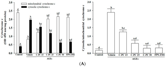Effects of treatments on AGEs-induced cytochrome c-dependent caspase activation in SH-SY5Y cells. SH-SY5Y cells were pre-exposed to C-phycocyanin (C-PC) at concentrations of 15 μmol/L (C-PC 15), 25 μmol/L (C-PC 25), or 50 μmol/L (C-PC 50), or to FPS-ZM1 (100 nmol/L) for 1 h, followed by stimulation with AGEs (300 μg/mL) for 24 h. (A) Cytochrome c levels were analyzed in both mitochondrial and cytosolic fractions, and the cytosolic-to-mitochondrial cytochrome c ratio was calculated. (B) Caspase-9 and caspase-3 activities were assessed based on cleavage of their respective synthetic substrates, Ac-LEHD-pNA and Ac-DEVD-pNA. (C) Cytosolic histone-associated DNA fragmentation was quantified using a cell death detection ELISA. Data are expressed as the mean ± SD from five independent experiments (n = 5), each conducted in triplicate. a p < 0.05, b p < 0.01 vs. untreated control group; c p < 0.05, d p < 0.01 vs. vehicle-treated cells stimulated with AGEs.