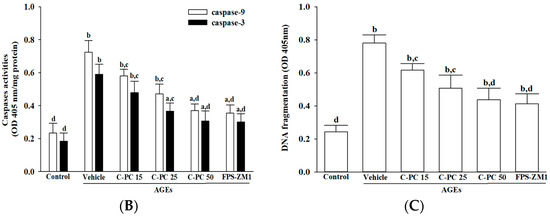 2.5. C-Phycocyanin Inhibits AGEs-Induced Cytochrome c-Mediated Intrinsic Apoptosis