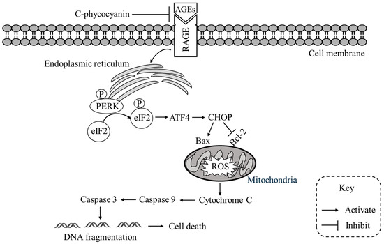 Proposed mechanism of C-phycocyanin against AGEs-induced apoptosis. AGEs binding to RAGE triggers ER stress and activates the PERK–eIF2α–ATF4–CHOP pathway, leading to Bax upregulation, Bcl-2 suppression, mitochondrial ROS accumulation, and cytochrome c release. This cascade activates caspase-9 and caspase-3, resulting in DNA fragmentation and apoptosis. C-phycocyanin blocks AGEs–RAGE interaction, alleviates ER stress, reduces ROS generation, and stabilizes mitochondrial integrity, thereby inhibiting caspase activation and preventing cell death.