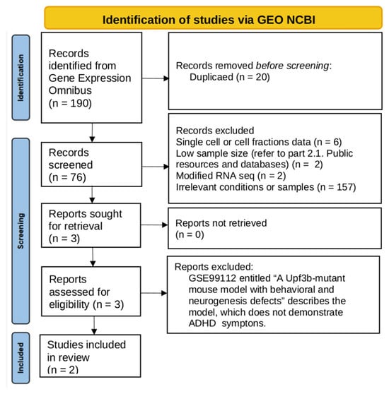 From an initial search of the GEO database, we identified 190 records. After the exclusion of non-relevant datasets, three reports were included for final identification (Figure 1). The GSE99112 was excluded because the Upf3b-mutant mouse did not demonstrate hyperlocomotion and seems to be a model for the other neurodevelopmental disorders rather than ADHD [57]. Two RNA-seq datasets listed in Table 1 were included in the comparative analysis.