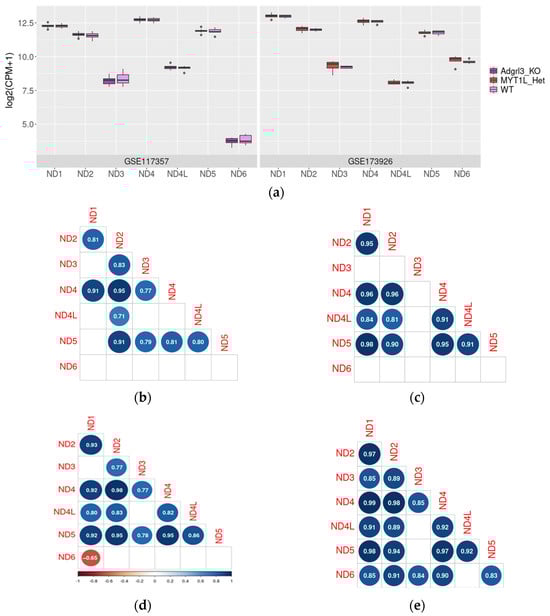 The NDs mRNA expression level in the PFC in wild-type mice and mice with mutations associated with ADHD-like behavior (in GSE117357 and GSE173926); the upper, middle, and lower lines of boxplots represent first quartiles, medians, and third quartiles (a). Correlations between NDs mRNA expression levels in the wild-type mouse PFC (b,d) for GSE117357 and GSE173926, respectively), PFC of Adgrl3-KO mice in the GSE117357 dataset (c), and MYT1L heterozygous knockout in GSE173926 (e). For Adgrl3-KO mice and their WT littermates, n = 6 for each group; for MYT1L heterozygous knockout mice and their WT littermates, n = 10 for each group.