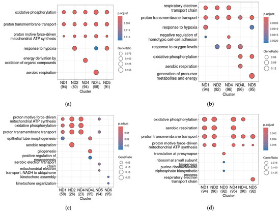 Meanwhile, in both the Adgrl3-KO mice in the GSE117357 dataset and the MYT1L heterozygous knockout in GSE173926, the top 100 gene clusters co-expressed with NDs include genes that are involved in the processes that are not related to energetic metabolism. In Adgrl3-KO mice in the GSE117357, these processes include neurogenesis and gliogenesis in the ND4L-co-expressed genes cluster and kinetochore organization in the ND6 co-expressed gene cluster (Figure 4c and its extended version in Supplementary Figure S1C). In the MYT1L-Het (GSE173926), ND3 is co-expressed with genes involved in the synaptic function (i.e., transport in presynapse, Figure 4d and its extended version in Supplementary Figure S1D). Also, in Adgrl3-KO mice, we revealed a pronounced loss of co-expression with other genes for ND1, ND2, and ND4 (only 66, 26, and 23 genes met the selected criteria). On the other hand, the number of ND4L-co-expressed genes increased in this ADHD model (Figure 4c; the data for the number of genes, which are co-expressed with each ND gene based on Pearson’s correlation, are detailed in Supplementary File S2).