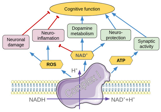 Diagram of the complex I role in regulation of processes involved in ADHD pathogenesis. Positive associations are marked by blue arrows, and negative regulation is indicated by red lines. Physico-chemical processes on Complex I are signed by purple arrows. ROS—reactive oxygen species, NAD—nicotinamide adenine dinucleotide, ATP—adenosine triphosphate. Parts of the figure were drawn by using pictures from Servier Medical Art. Servier Medical Art by Servier is licensed under a Creative Commons Attribution 3.0 Unported License.