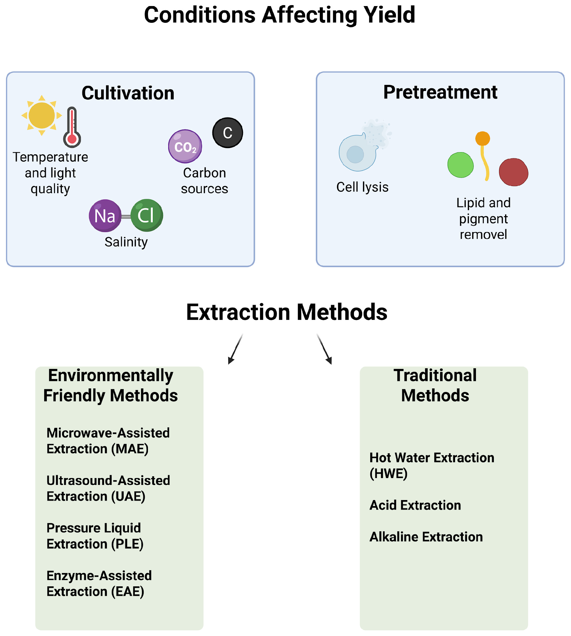 | Method | Eco-Friendly | Algae | Polysaccharides | Yield | References |