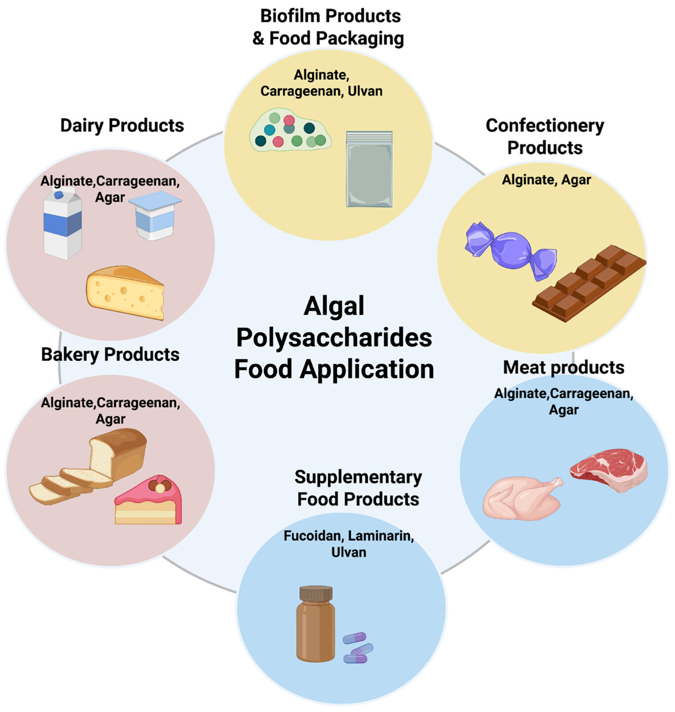 | Food Products | Algae/Polysaccharides | Optimal Concentration | Activity | References |
