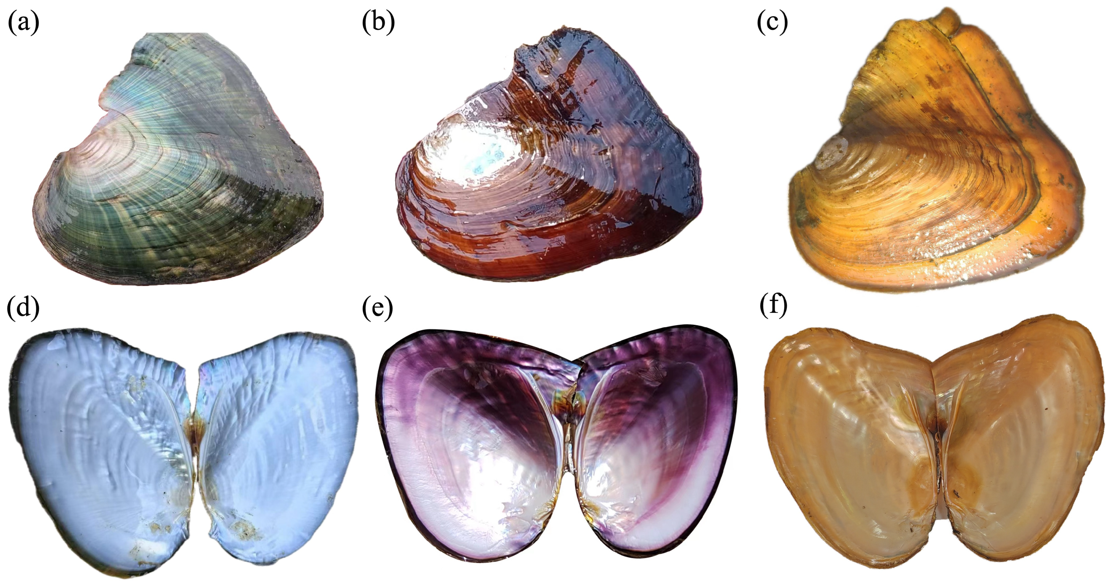 - Wang, Z.; Hu, H.; Wang, H.; Yan, L.; Zhang, Y.; Wang, H.; Lv, X.; Li, J.; Bai, Z. Genome-wide association analysis reveals genetic architecture of growth and inner shell color traits in freshwater pearl mussel Hyriopsis cumingii (Lea 1852). Aquaculture 2025, 595, 741658. [Google Scholar] [CrossRef]