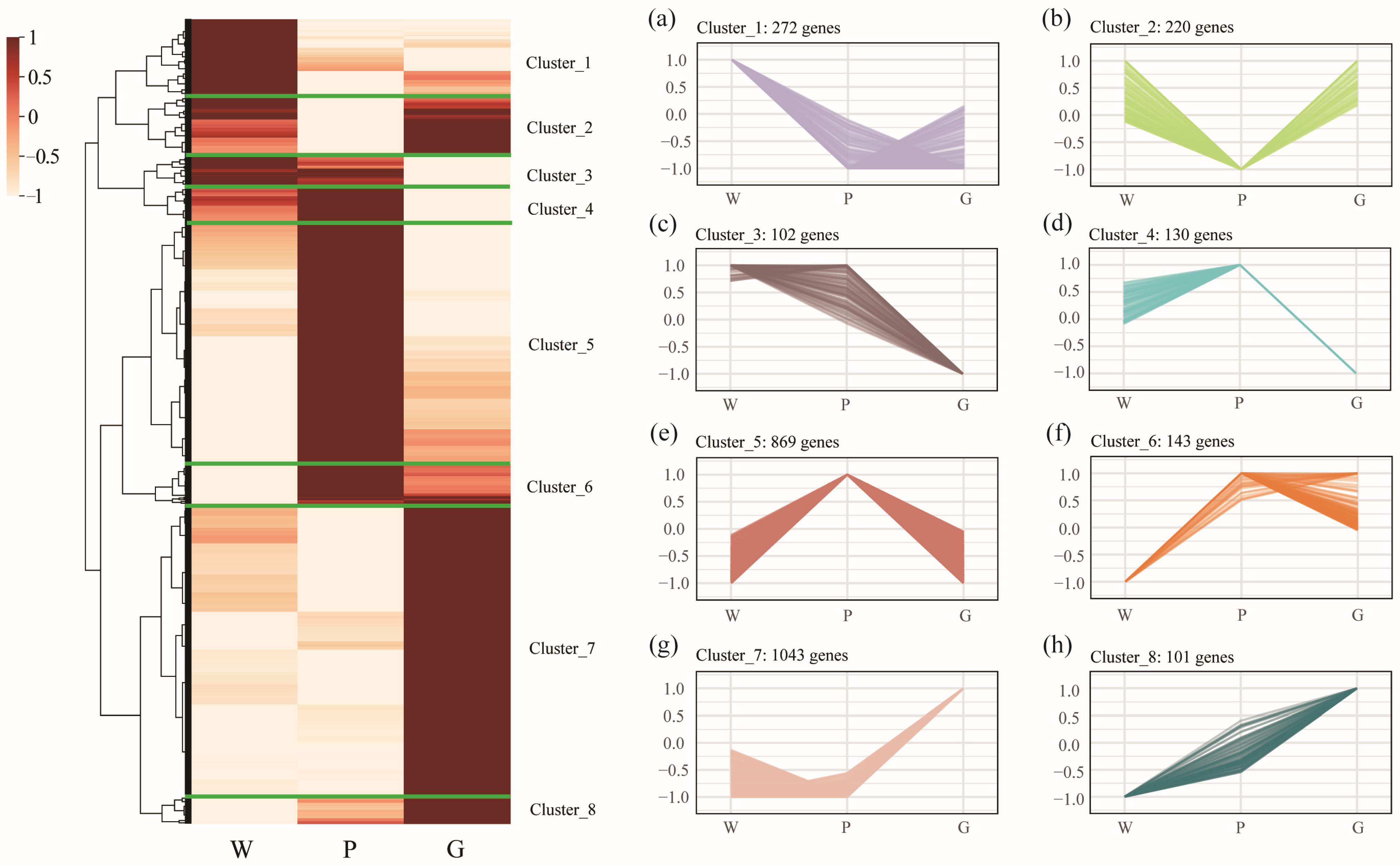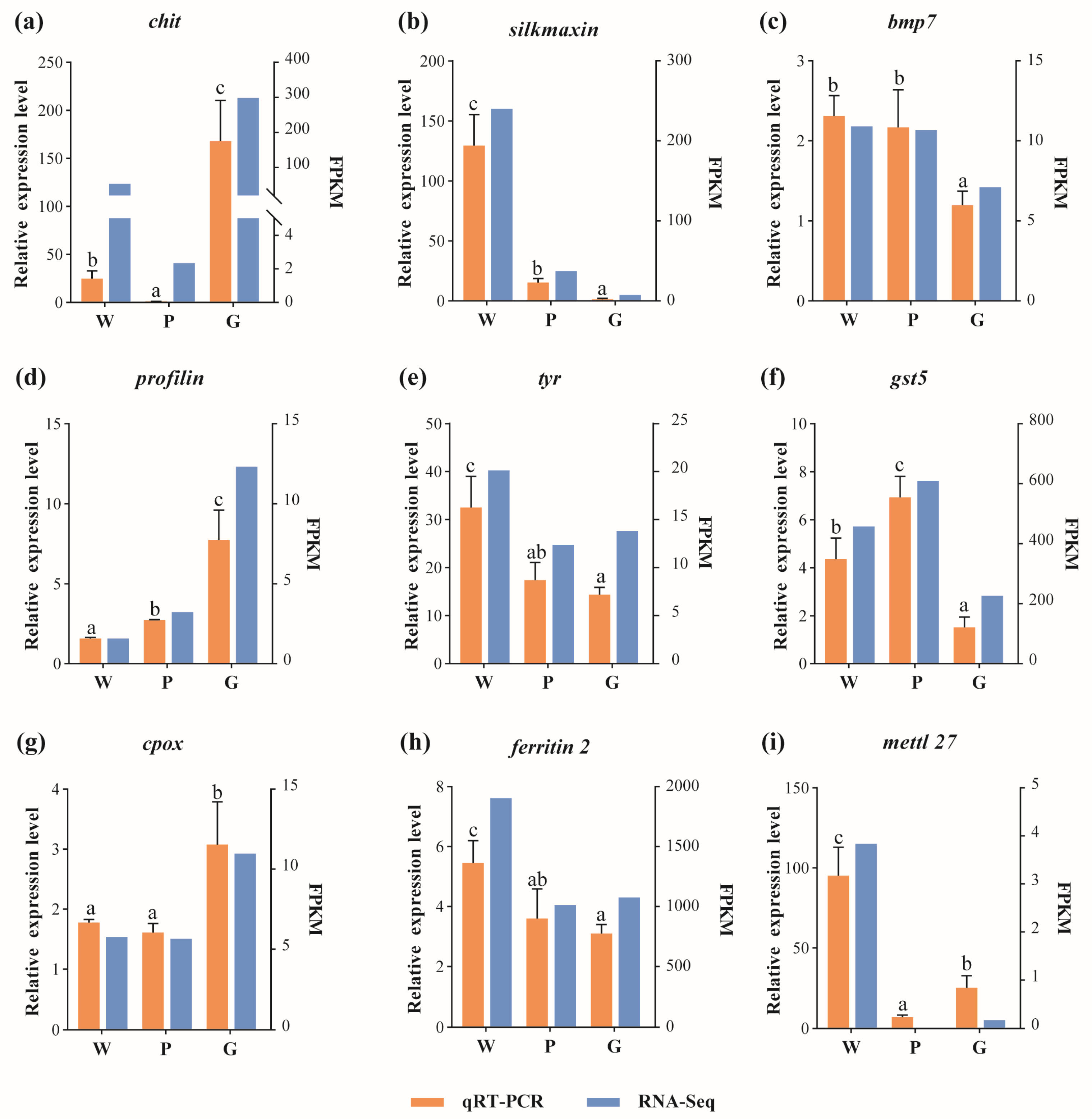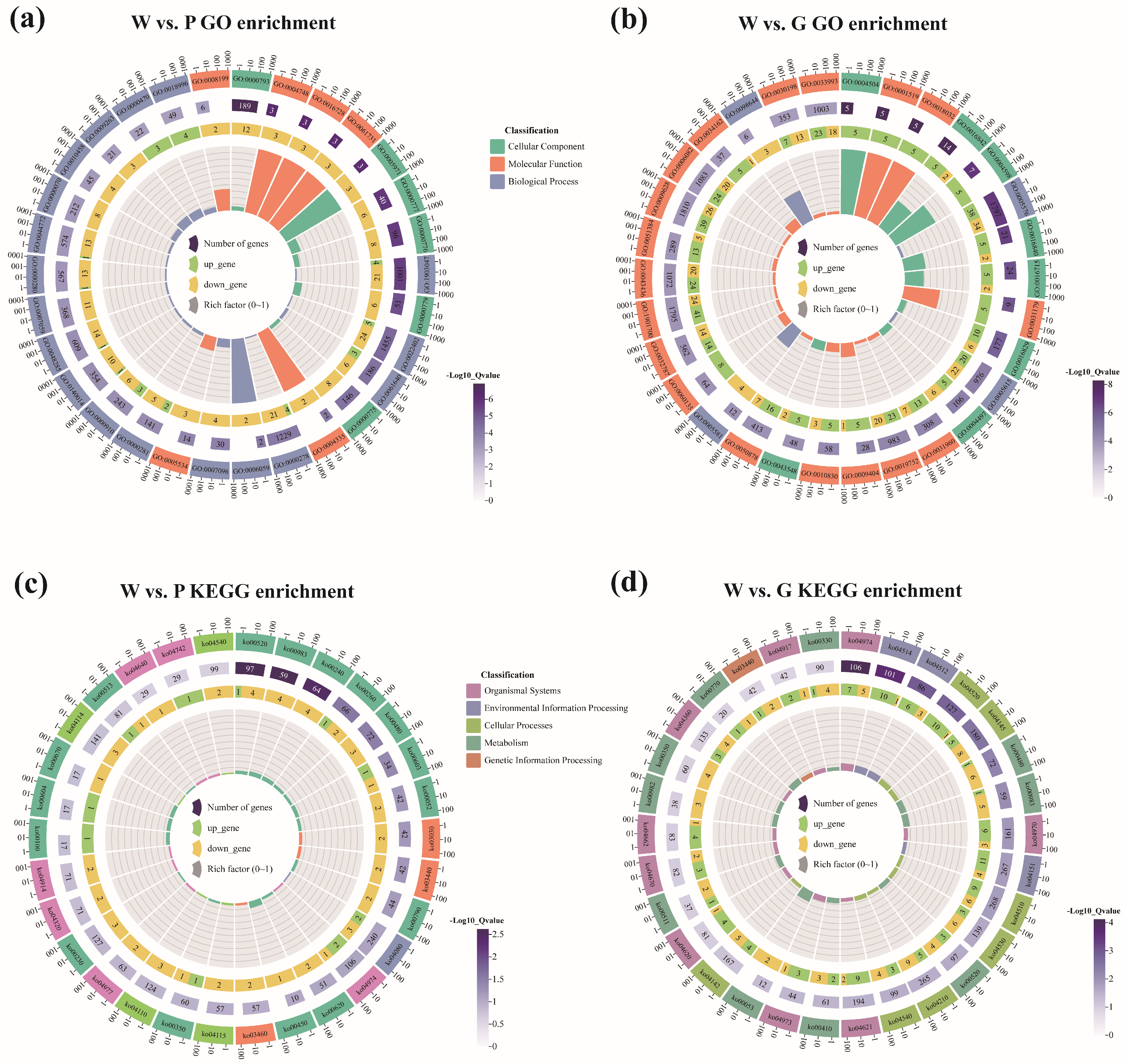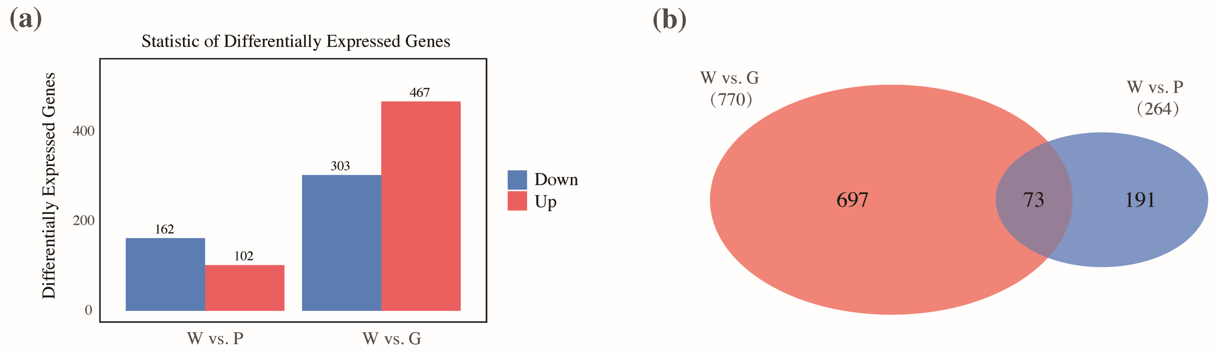 2.2. Differentially Expressed Genes (DEGs) in Two Comparisons: W vs. P and W vs. G