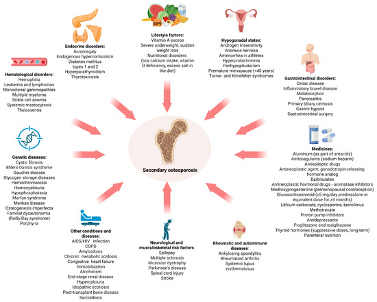 Osteoporosis is classified as primary and secondary [10,16]. Primary OP represents an independent disease that predominates in postmenopausal women with decreased estrogen secretion and in men over the age of 50, in whom sex hormone-binding globulin inactivates testosterone and estrogen as they age, which can reduce bone mineral density (BMD) over time [1]. There are also distinct, extremely rare forms of primary OP, such as idiopathic osteoporosis in premenopausal women or men under 50 and juvenile osteoporosis in children. Secondary OP is caused by a variety of conditions, diseases, and medications, as summarized in Figure 1.