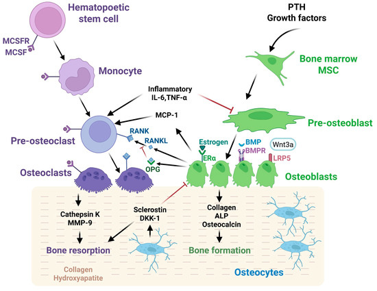 Bone tissue homeostasis is governed by the regulatory pathways of osteoblastogenesis (canonical WNT signaling pathway, bone morphogenetic protein (BMP) signaling pathway) and osteoclastogenesis (RANKL/RANK/OPG signaling pathway, estrogen/α-estrogen receptor). Pro-inflammatory cytokines (IL6, TNFα) and growth factors (TGF-β) produced by immune cells and adipose tissue also influence the balance between osteoblast and osteoclast formation and their apoptosis [28,29,30]. Genetic predisposition, oxidative stress, and cellular aging may also contribute to the development of osteoporosis [31,32,33].