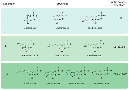 Chemical structures and antiresorptive potential of different generations of bisphosphonates. * Antiresorptive potential relative to nitrogen-free bisphosphonates.