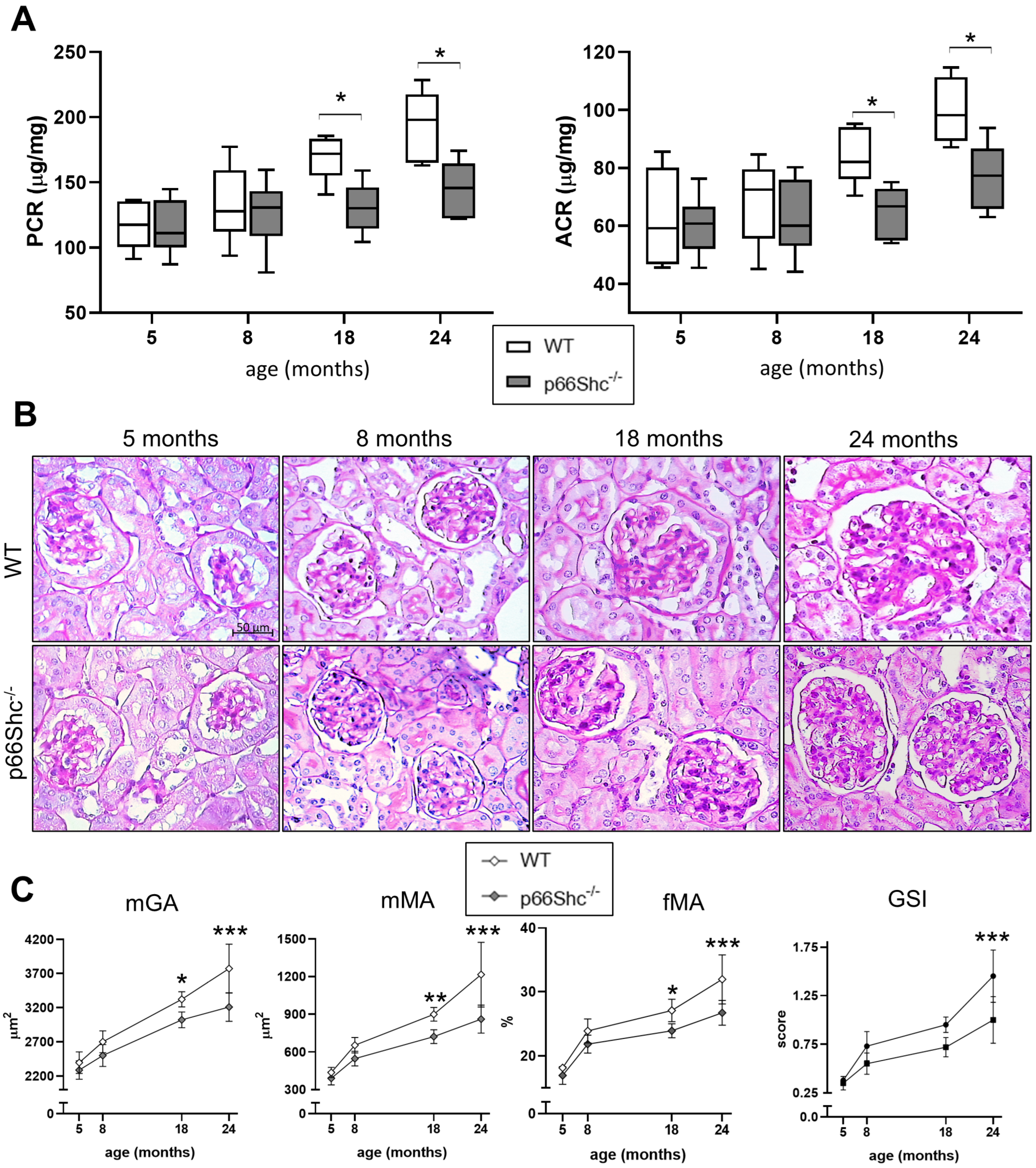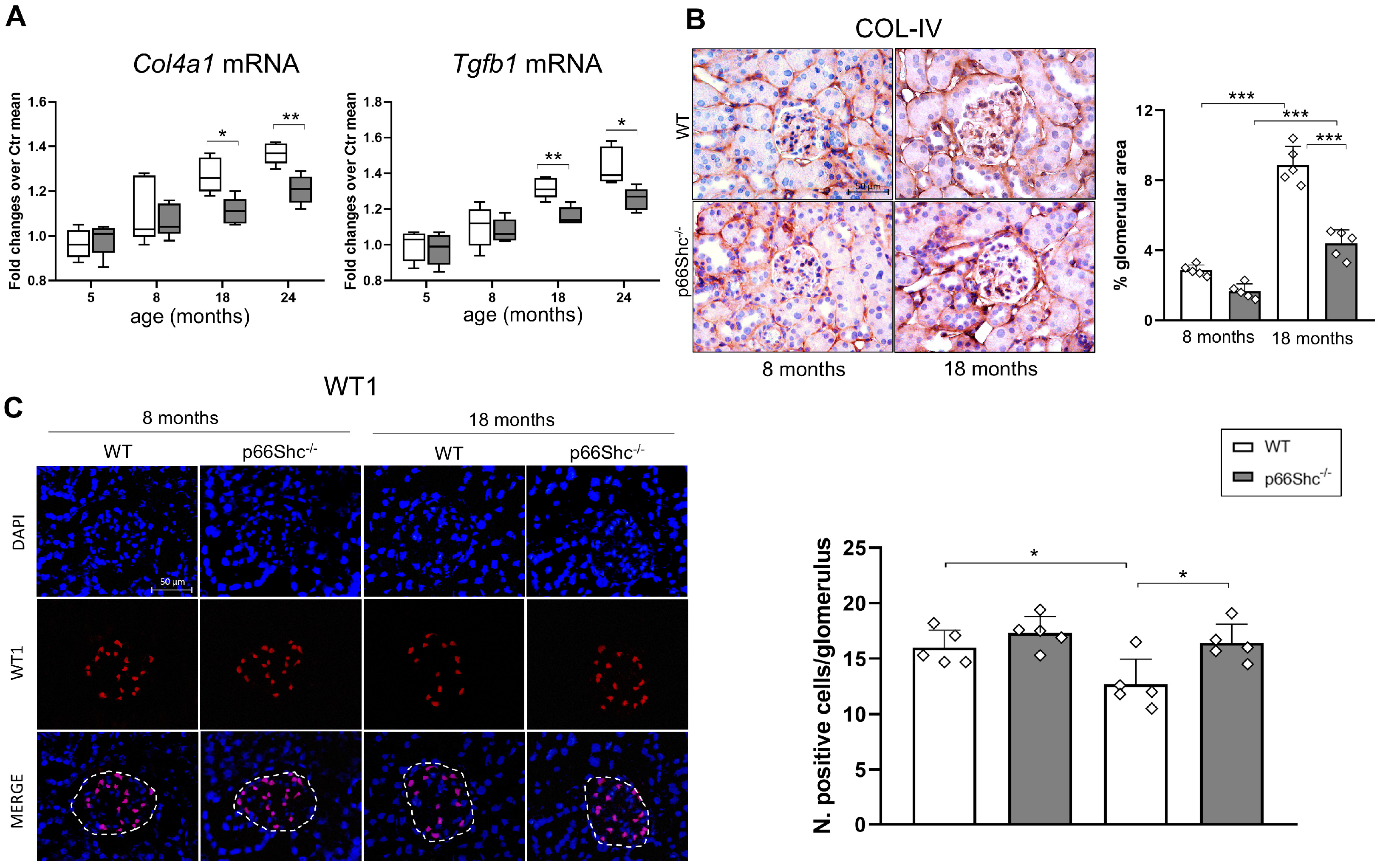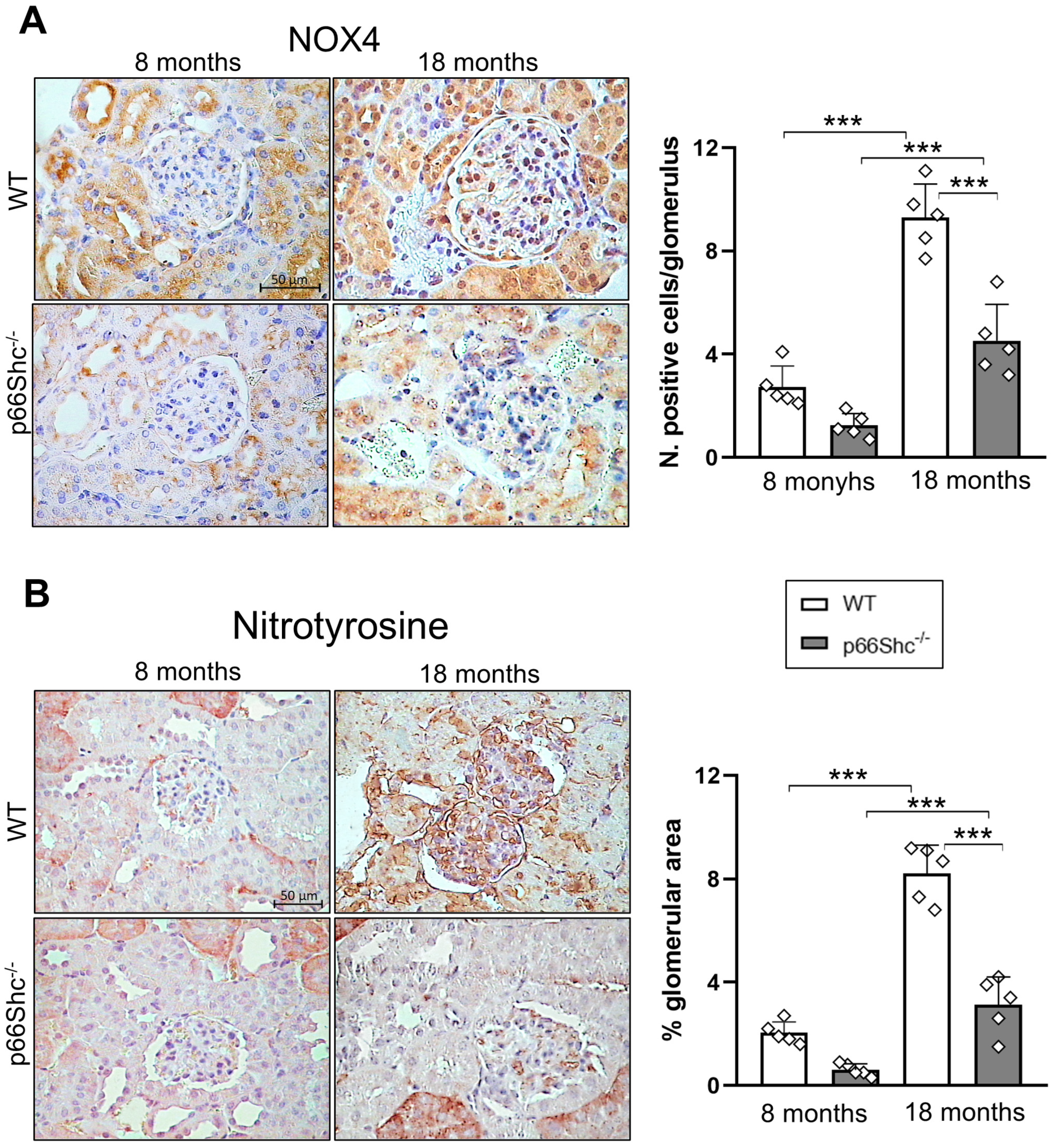 - Vashistha, H.; Marrero, L.; Reiss, K.; Cohen, A.J.; Malhotra, A.; Javed, T.; Bradley, A.; Abbruscato, F.; Giusti, S.; Jimenez, A.; et al. Aging Phenotype(s) in Kidneys of Diabetic Mice Are P66ShcA Dependent. Am. J. Physiol. Ren. Physiol. 2018, 315, F1833–F1842. [Google Scholar] [CrossRef] [PubMed]