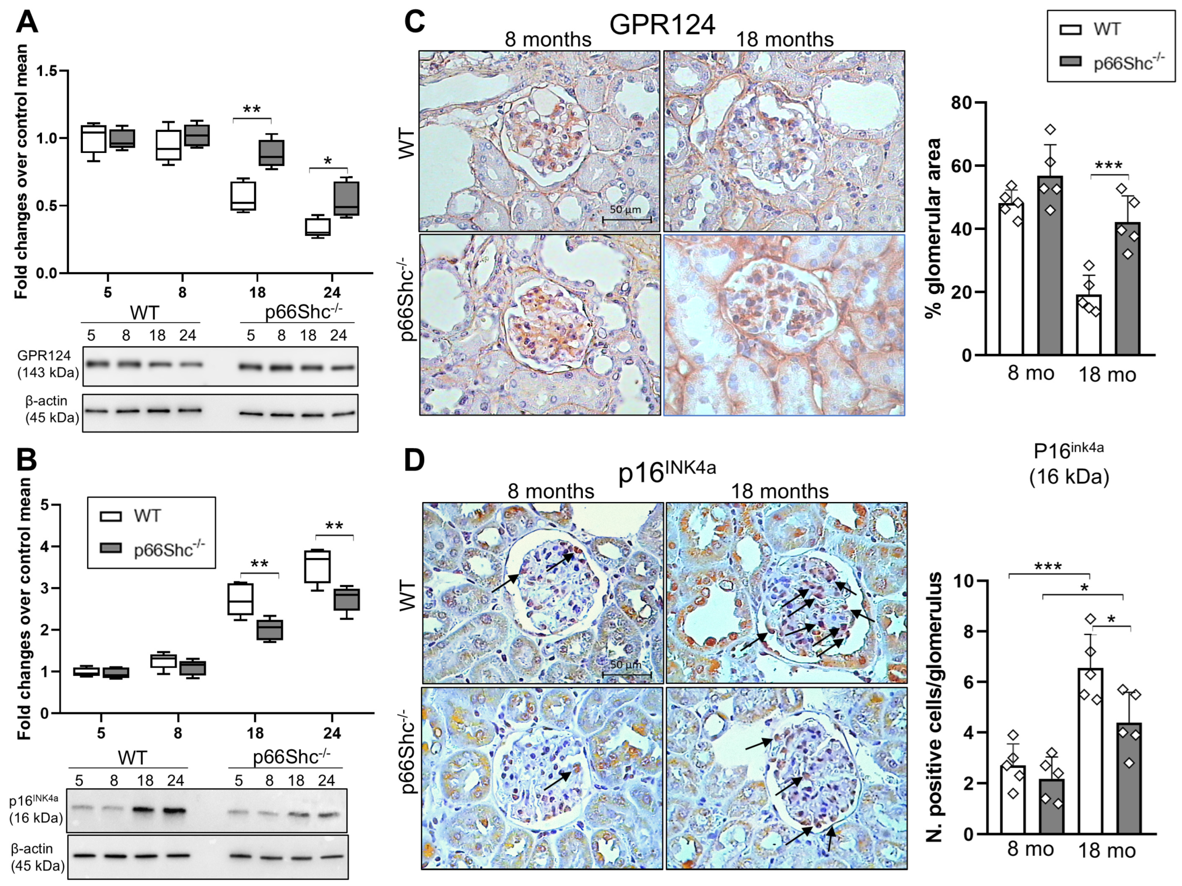 Iacobini C, Vitale M, Sentinelli F, Lucarelli A, Haxhi J, Sergio I, Pugliese G, Menini S. Protective Role of p66Shc Deletion in Physiological Renal Aging: Effects on G Protein-Coupled Receptor 124 Expression and Associated Cellular Senescence. International Journal of Molecular Sciences. 2025; 26(22):11096. https://doi.org/10.3390/ijms262211096