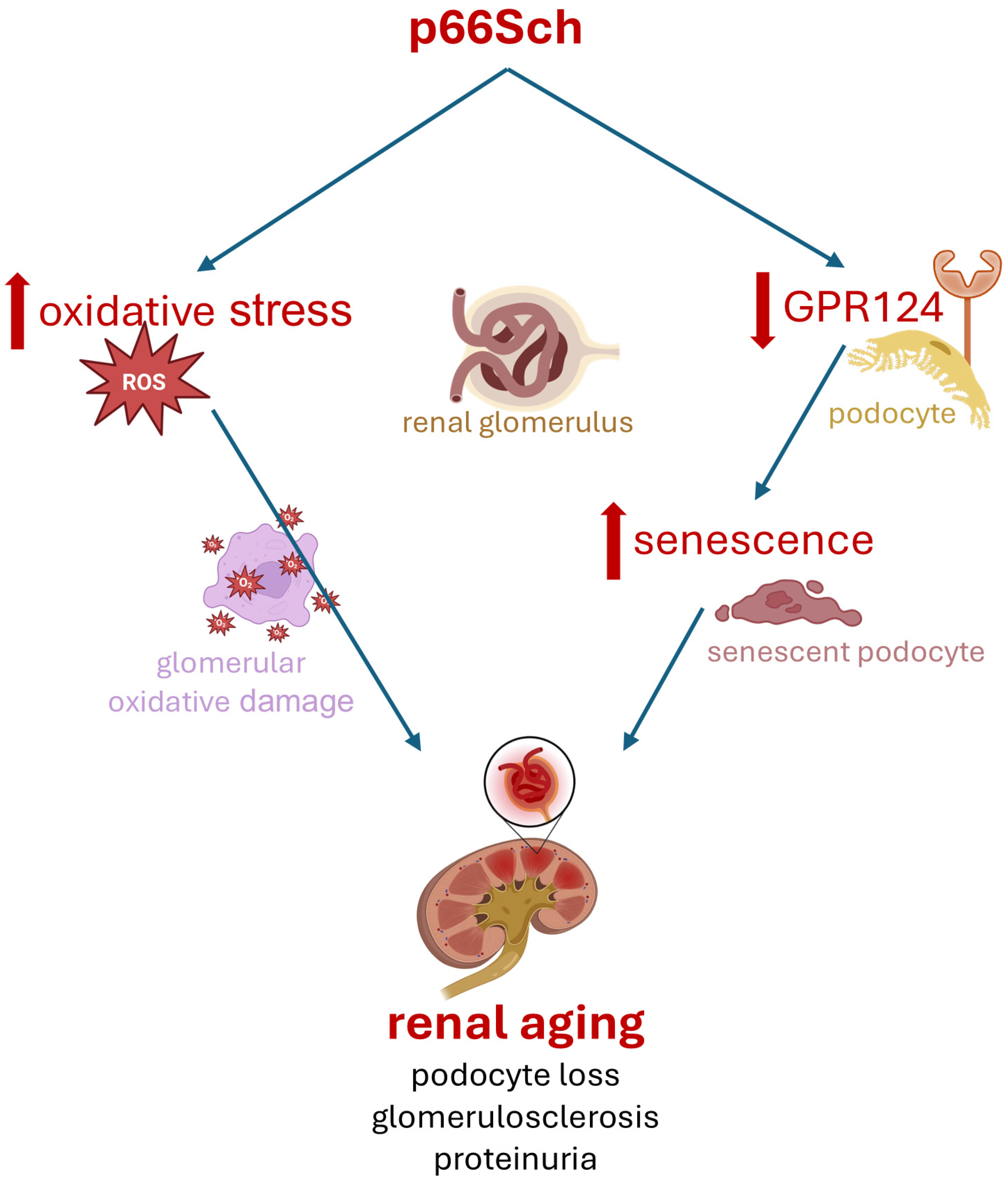 Iacobini, C.; Vitale, M.; Sentinelli, F.; Lucarelli, A.; Haxhi, J.; Sergio, I.; Pugliese, G.; Menini, S. Protective Role of p66Shc Deletion in Physiological Renal Aging: Effects on G Protein-Coupled Receptor 124 Expression and Associated Cellular Senescence. Int. J. Mol. Sci. 2025, 26, 11096. https://doi.org/10.3390/ijms262211096