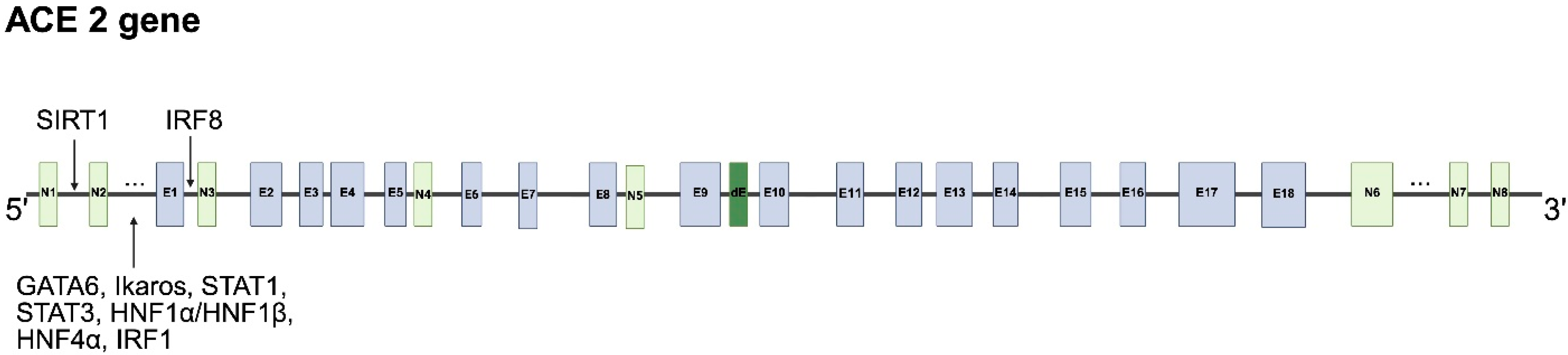 Figure 2. Diagram of ACE2 gene. The 18 initially identified exons, E1 to E18, are shown in gray, and exon 1 of the truncated ACE2 variant, dE, is highlighted in dark green. Additionally, the predicted exons associated with alternative splicing are depicted in light green [37,38,39,40,41]. Regulation of ACE2 expression at the transcriptional level is controlled by different transcription factors depending on the tissue. The localization of transcription factor binding sites is indicated by arrows [13,39,40,41,42]. This figure was designed using BioRender (https://www.biorender.com).