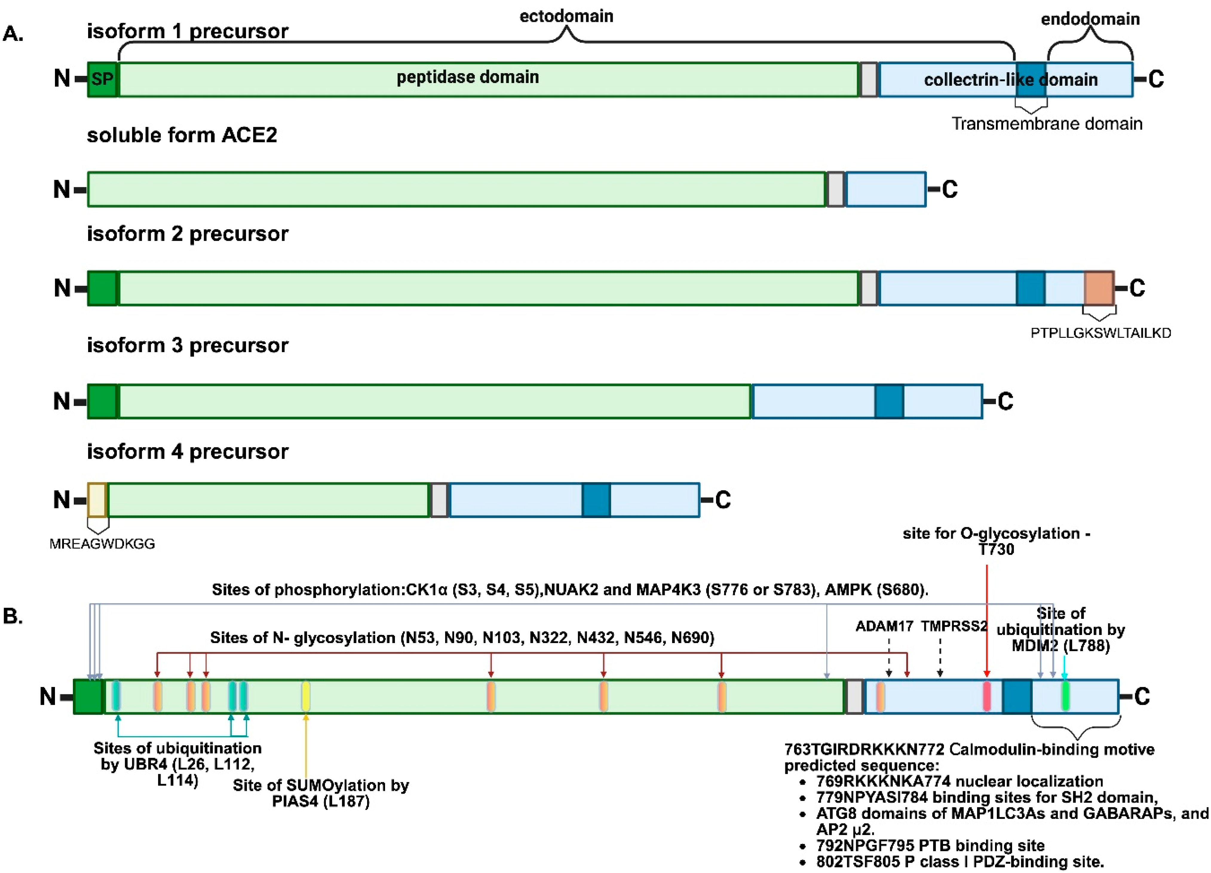 Figure 3. ACE2 protein’s structure. (A) A comprehensive diagram of the ACE2 protein’s domain structure, emphasizing its forms and isoforms [39]. (B) A schematic representation of the ACE2 protein, indicating sites of sheddase cleavage, post-translational modifications, and its protein interactions. SP—signal peptide. This figure was designed using BioRender (https://www.biorender.com). Panel A was adopted from Stocker et al. (2023) [39] (CC BY4.0).