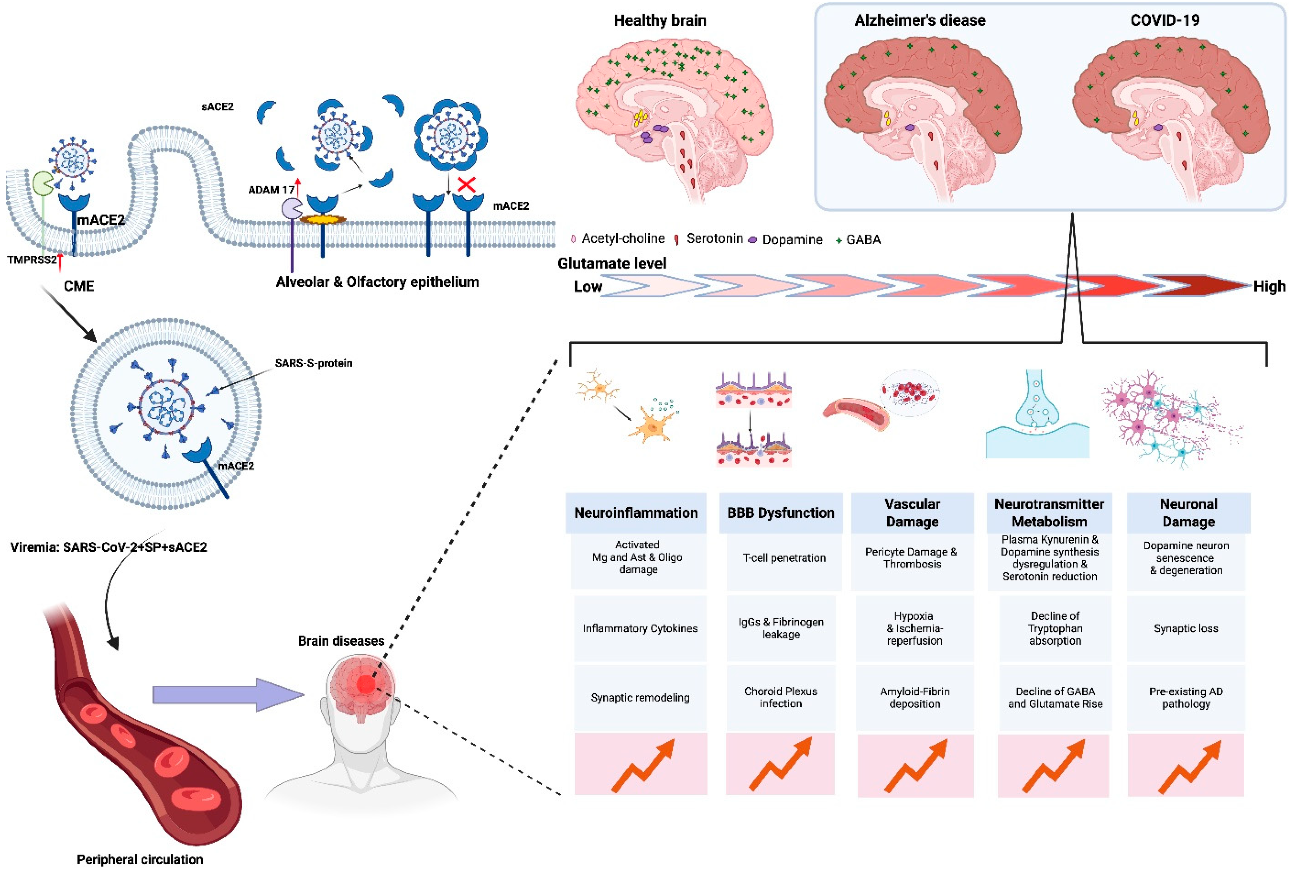 Figure 4. SARS-CoV-2 infection may cause damage in neurotransmitter systems in a similar manner to Alzheimer’s disease. The marked decline in the enzymatic activity of mACE2, fueled by heightened ADAM17 and TMPRSS2 activation, together with SARS-CoV-2, could aggravate RAS imbalance (Ang II/ACE2/Ang(1–7)) in patients suffering from particular comorbidities, including neurodegenerative (including Alzheimer’s/Parkinson’s diseases) and cardiovascular diseases, diabetes, and chronic lung illnesses. High CHI3L1, ADAM17, and TMPRSS2 activity is characteristic of these comorbidities. SARS-CoV-2 virions attach to host receptors, triggering clathrin-mediated endocytosis (CME), where proteases like TMPRSS2 process the S-protein (SP) and mACE2. This process helps the virus fuse with the mucus membranes of mainly the olfactory system (OS) and lungs. The virus can spread through the OS and bloodstream, allowing it to infect the choroid plexus and brain cells that carry ACE2, along with the proteases TMPRSS2, CTSL, and FURIN. Virus attachment also triggers a change in the cytoplasmic ACE2 tail that enhances ADAM17 activation. When ADAM17 is activated, it releases sACE2, which can either prevent or enhance virus entry through the ATR1 receptor. Unexpectedly, the cytoplasmic ACE2 tail, as well as ADAM17 expression, proved to be necessary for SARS-CoV infection. TMPRSS2 and ADAM17 work together to cut ACE2’s tail, which protects lung and heart tissues from RAS activation. Nonetheless, TMPRSS2 alone cannot yield enzymatically active sACE2. Hence, TMPRSS2-mediated ACE2 cleavage would be more harmful to the host. Increased levels of TMPRSS2 from androgen hormones and/or CHI3L1 can affect ACE2 cleavage, decrease mACE2 and sACE2, and impair RAS function. This hypothesis implies that the increased TMPRSS2 in the nasal epithelial cells of Black individuals might explain why they face higher rates of COVID-19 infection and poorer outcomes through enhanced cleavage of SARS-CoV-2 and ACE2. This figure was designed using an image from BioRender (https://www.biorender.com) [8,18,27,76,96,155,161,187,189].