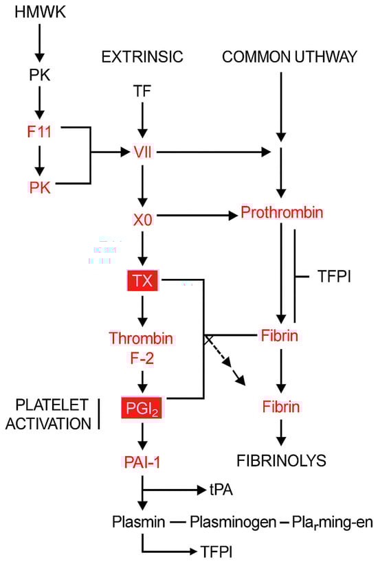 Schematic representation of the coagulation and fibrinolysis pathways, highlighting genes downregulated by LAQ. This figure illustrates the intrinsic, extrinsic, and common pathways of coagulation, as well as the fibrinolytic system and platelet activation. Genes shown in red represent those found to be significantly downregulated in PBMCs from RRMS patients following treatment with LAQ (0.6 mg/day) for 6 months. This transcriptional suppression suggests that LAQ reduces the activity of several critical regulators of coagulation and fibrin turnover. Abbreviations: F2—Prothrombin (precursor to thrombin), F11 (XI)—Factor XI (intrinsic pathway), F7 (VII)—Factor VII (extrinsic pathway), TF—Tissue Factor (initiates extrinsic pathway), PK—Prekallikrein, HMWK—High-molecular-weight kininogen, TX—Thromboxane. Red boxed elements highlight critical regulatory hubs within the pathway that are both affected and central to pathway integration (e.g., F2 [thrombin], PAI-1), based on their biological importance and number of downstream effects. Black arrows: normal activation flow in the pathway. Flat-ended lines: Inhibitory interactions.