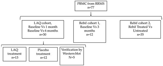 Participants were eligible for inclusion if they met all of the following criteria: (a) Diagnosis of RRMS according to the 2010 revised McDonald criteria; (b) age between 18 and 60 years; (c) Expanded Disability Status Scale (EDSS) score between 0.0 and 5.5 at baseline; (d) no immunosuppressive therapy for at least three months prior to enrollment; (e) no corticosteroid treatment within 30 days before sample collection; (f) planned initiation of first-line monotherapy with either LAQ (0.6 mg daily) for the LAQ cohort or Rebif (44 µg subcutaneously, three times weekly) for Rebif cohort 1; (g) for Rebif cohort 2, treatment with Rebif (new formulation, Merck-Serono, Merck KGaA, Darmstadt, Germany) at a dose of 22 or 44 µg, subcutaneously three times per week, for at least four months prior to study initiation; (h) untreated participants were free from immunomodulatory drugs for at least one month prior to sampling; and (i) in Rebif cohort 2, treated participants had received IFN-β therapy for at least four months before enrollment.