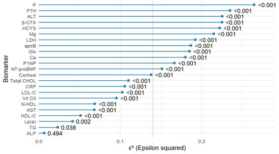 The largest effect sizes (ε2) were observed for P (ε2 = 0.264, p < 0.001), PTH (ε2 = 0.235, p < 0.001), ALT (ε2 = 0.225, p < 0.001), β-CTX (ε2 = 0.225, p < 0.001), HCYS (ε2 = 0.222, p < 0.001), Mg (ε2 = 0.215, p < 0.001), LDH (ε2 = 0.192, p < 0.001), apoB (ε2 = 0.187, p < 0.001), and Glu (ε2 = 0.185, p < 0.001). Several additional biomarkers, including Ca, P1NP, NT-proBNP, cortisol, and Total CHOL, also showed medium-to-large effect sizes (ε2 > 0.06, all p < 0.001). Lower effect sizes, though statistically significant, were observed for LDL-C, CRP, Vit D3, AST, HDL-C, and Lp(a). TG and ALP demonstrated the lowest effect sizes (ε2 = 0.023, p = 0.038 and ε2 = 0.007, p = 0.494, respectively), with ALP not reaching statistical significance (Figure 1). Overall, Figure 1 shows that several biomarkers exceeded the ε2 = 0.14 cut-off point, indicating large effects.