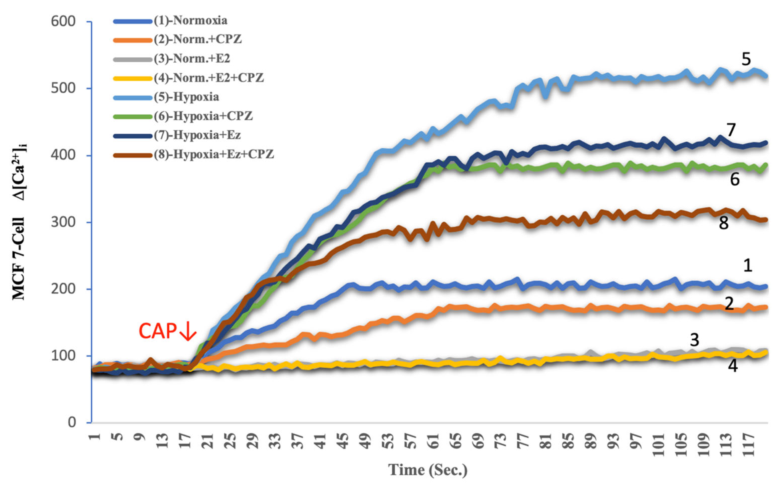 Effects of E2 on intracellular Ca2+ dynamics in MCF-7 cells under hypoxic and normoxic conditions (mean ± SEM, n = 3). Fluorescence-based Ca2+ imaging was performed using Fura-2 AM. The arrow indicates the time point of capsaicin (CAP, 1 μM) application to activate TRPV1 channels. Hypoxia markedly elevated intracellular Ca2+ levels compared with normoxia (trace 5 vs. 1), confirming enhanced TRPV1 activity under low-oxygen conditions. E2 treatment significantly attenuated this Ca2+ rise (trace 7 vs. 5), and the TRPV1 antagonist capsazepine (CPZ, 10 μM) abolished the CAP-induced signal in both normoxic and hypoxic states (traces 2, 4, 6, and 8). These data indicate that hypoxia sensitizes TRPV1-mediated calcium entry, whereas estradiol counteracts this effect, supporting its protective role against hypoxia-induced calcium overload in MCF-7 cells.