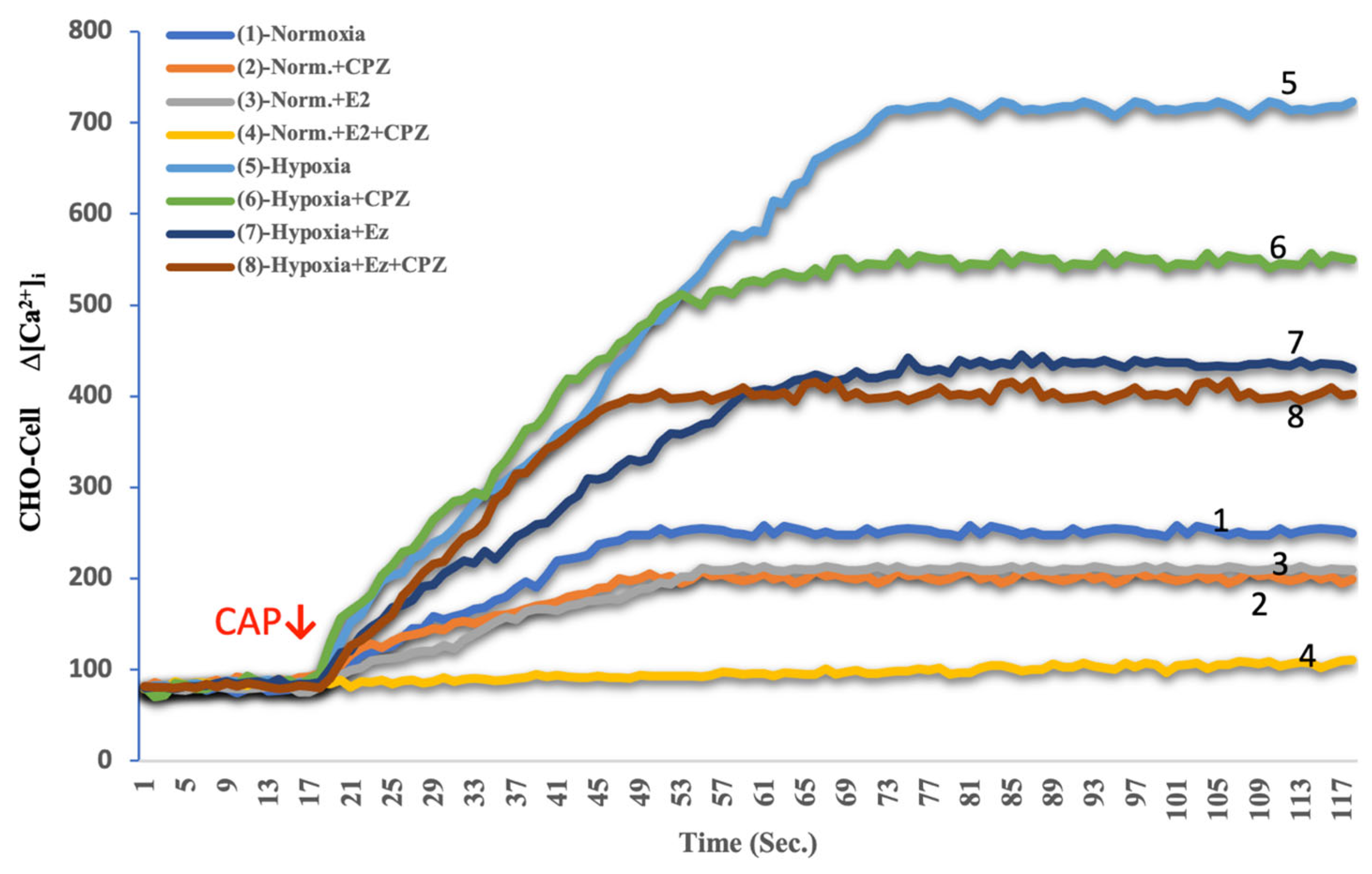 Effects of E2 on intracellular Ca2+ dynamics in TRPV1-transfected CHO cells under hypoxic and normoxic conditions (mean ± SEM, n = 3). These CHO cells were transiently transfected with a full-length human TRPV1 construct to enable functional Ca2+ imaging of TRPV1 activity. Fluorescence recordings were obtained using Fura-2 AM, and the red arrow indicates the time of capsaicin (CAP, 1 μM) application to activate TRPV1 channels. Hypoxia markedly enhanced Ca2+ influx compared with normoxia (trace 5 vs. 1), consistent with increased TRPV1 responsiveness under low-oxygen stress. Unlike ERα-positive MCF-7 cells, E2 treatment did not significantly alter the Ca2+ response (trace 7 vs. 5), confirming the absence of estrogen-dependent modulation in ERα-negative CHO cells. Capsazepine (CPZ, 10 μM) suppressed the CAP-evoked signal in all conditions (traces 2, 4, 6, 8), validating TRPV1 specificity. Together, these data demonstrate that hypoxia enhances TRPV1-mediated calcium entry independently of estrogen signaling in CHO-TRPV1 cells.