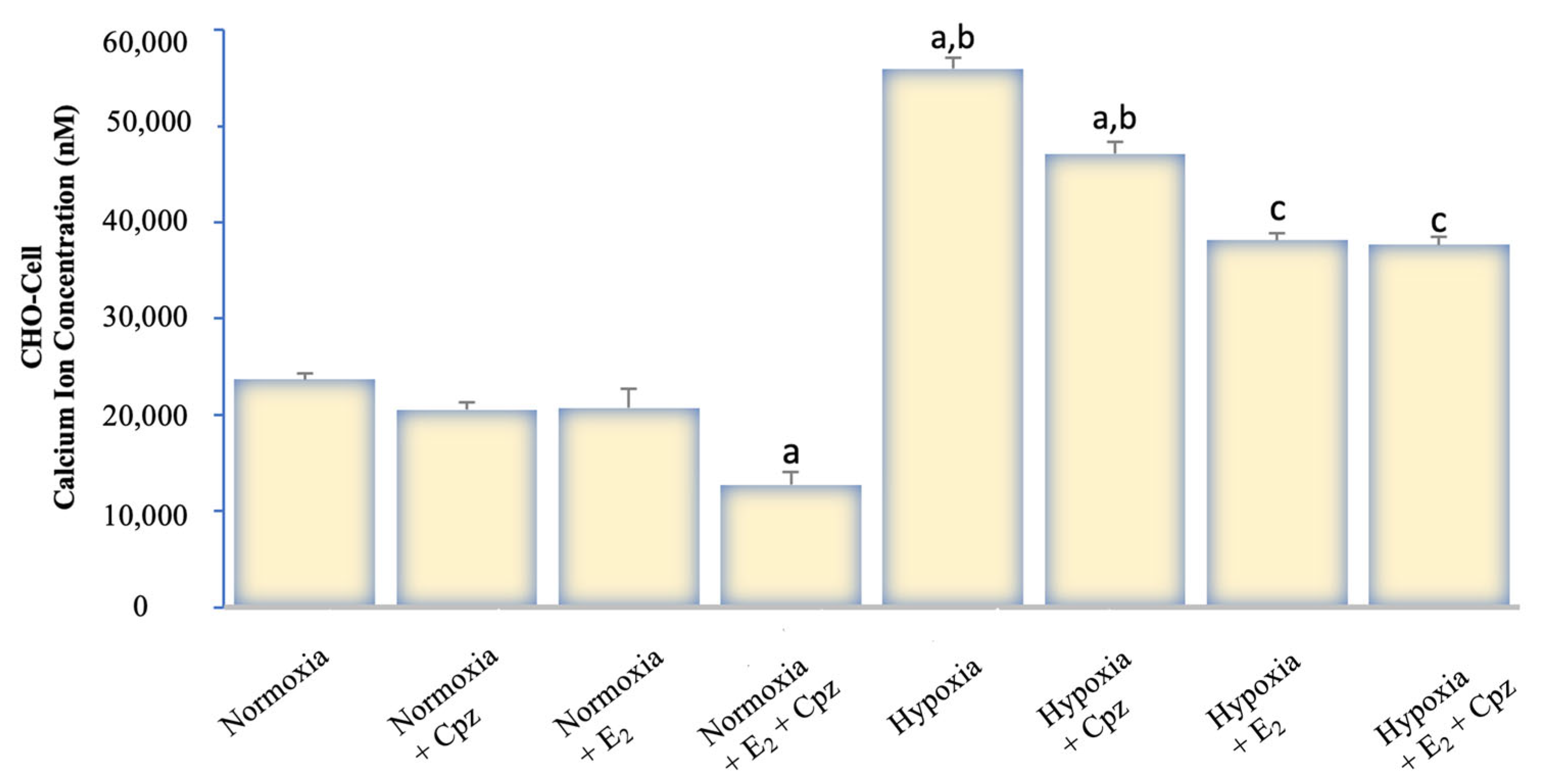 Quantitative analysis of intracellular Ca2+ concentration in TRPV1-transfected CHO cells under normoxic and hypoxic conditions following treatment with E2 and/or capsazepine (CPZ) (mean ± SEM, n = 3). Hypoxia caused a pronounced elevation in intracellular Ca2+ levels compared with normoxia (p < 0.001), confirming strong TRPV1 activation under low-oxygen stress. In contrast to ERα-positive MCF-7 cells, E2 did not significantly modify Ca2+ accumulation in CHO-TRPV1 cells, indicating the absence of estrogen-dependent modulation. CPZ treatment markedly reduced Ca2+ influx in both normoxic and hypoxic conditions, verifying TRPV1 channel specificity. Statistical significance: a p < 0.001 vs. Normoxia; b p < 0.001 vs. E2; c p < 0.001 vs. Hypoxia.