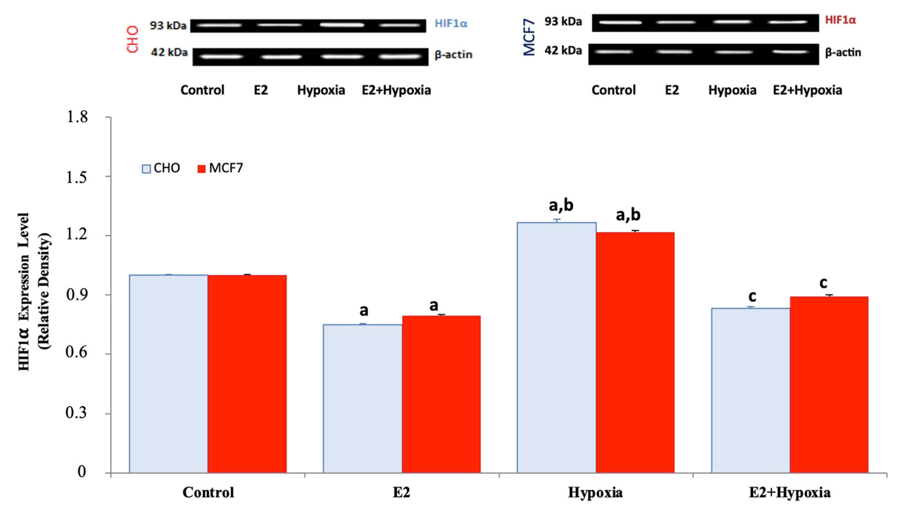 Representative immunoblots and quantitative analysis of hypoxia-inducible factor 1-alpha (HIF-1α) protein expression in MCF-7 and TRPV1-transfected CHO cells under normoxic and hypoxic conditions following E2 treatment (mean ± SEM, n = 3). β-Actin served as a loading control for normalization. Hypoxia markedly increased HIF-1α expression in both cell lines compared with control (p < 0.05), consistent with activation of the canonical hypoxic response. E2 alone slightly decreased basal HIF-1α levels relative to control (p < 0.05), whereas co-treatment with E2 during hypoxia significantly attenuated the hypoxia-induced up-regulation of HIF-1α (p < 0.01 vs. hypoxia). These results demonstrate that E2 suppresses hypoxia-driven HIF-1α stabilization in ERα-positive MCF-7 cells, whereas this regulatory effect is less pronounced in ERα-negative CHO-TRPV1 cells. Statistical significance: a p < 0.05 vs. Control; b p < 0.01 vs. E2; c p < 0.01 vs. Hypoxia. Note: The increase in HIF-1α band intensity in MCF-7 cells is modest but statistically significant when quantified across replicates (p < 0.01).