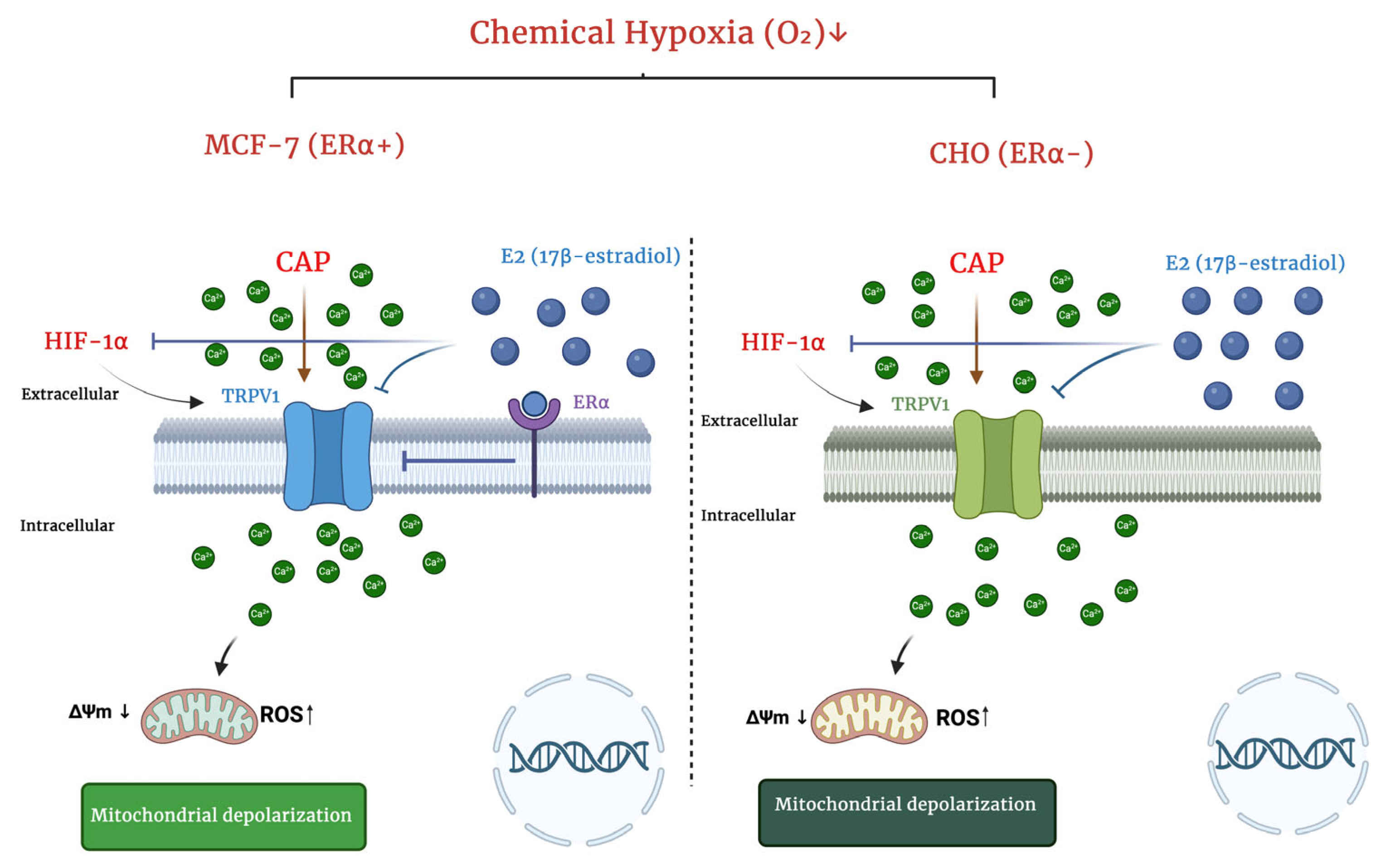 In summary, this study demonstrates that hypoxia stabilizes HIF-1α, increases TRPV1 expression, and amplifies Ca2+ influx in both MCF-7 and CHO-TRPV1 cells, confirming a functional coupling between HIF-1α activation and TRPV1 channel responsiveness. Importantly, in ERα-positive MCF-7 cells, E2 significantly counteracted the hypoxia-induced up-regulation of both HIF-1α and TRPV1, thereby limiting the extent of Ca2+ accumulation. In contrast, ERα-deficient CHO-TRPV1 cells displayed a purely channel-driven response, as E2 had no detectable effect on Ca2+ influx or TRPV1 expression. These observations establish two mechanistically distinct modes within the hypoxia, HIF-1α, TRPV1 and Ca2+ axis: an ER-dependent regulatory pathway, in which estrogen signaling suppresses excessive calcium entry, and an ER-independent pathway, in which TRPV1 activation proceeds unrestrained by hormonal modulation.