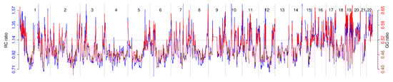 Genome-wide Read Count and GC Ratio Signals. The following highlights are the same. The blue line represents the normalized read count (NRC), and the red line represents the GC ratio.