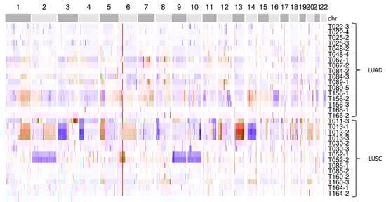 Heatmap of GC bias-corrected CNA segmentations in LUAD and LUSC subjects. Red indicates copy number gains, and blue indicates copy number losses. Chromosome numbers are shown along the top of the heatmap, and sample identifiers are displayed along the right side.
