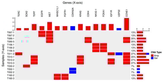 We investigated CNA segments exceeding the detection threshold calculated using the method described in our previous study []. A total of 33 LUAD genes and 42 LUSC genes reported as focally gained or deleted in the pan-cancer study by the TCGA Research Network [] were used as reference lists to assess gene-level alterations in our dataset. Figure 6 illustrates LUAD- and LUSC-related genes observed within CNA regions in our cfDNA WES samples.