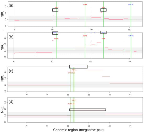 Examples of NSCLC-related genes detected within CNA segments. (a,b) Copy number gains involving EGFR and MET genes on chromosome 7 in samples T067-1 and T067-2, respectively. (c,d) Copy number gains involving WHSC1L1 and FGFR1 genes on chromosome 8 in samples T160-2 and T160-3, respectively. Each red segment represents the copy number state along genomic regions. Black rectangles mark confirmed CNA segments encompassing NSCLC-related genes. Green vertical lines indicate the genomic positions of the candidate genes. Blue segments denote CNAs whose values exceed the upper limit of the figure. Segments within the light gray area fall below the detection threshold and are considered neutral regions.
