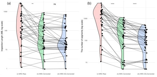 Comparison of gene detection cost before and after GC bias correction. (a) Detection cost measured by the total inspection length. ‘NRC Raw’ (red) indicates results without a control sample. ‘NRC Corrected’ (green) indicates results using a control sample. ‘NRC GC-Corrected’ (blue) indicates results using a control sample with additional GC bias correction. (b) Detection cost measured by the number of segments. The statistical significance between two groups is indicated as follows: ns, not significant (); ** ; **** .