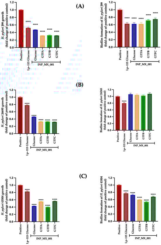4.7. In Vitro Inhibition of H. pylori Strains’ Biofilm Formation by EPSs and E/S Products of the INP_MX_001 LAB Strain