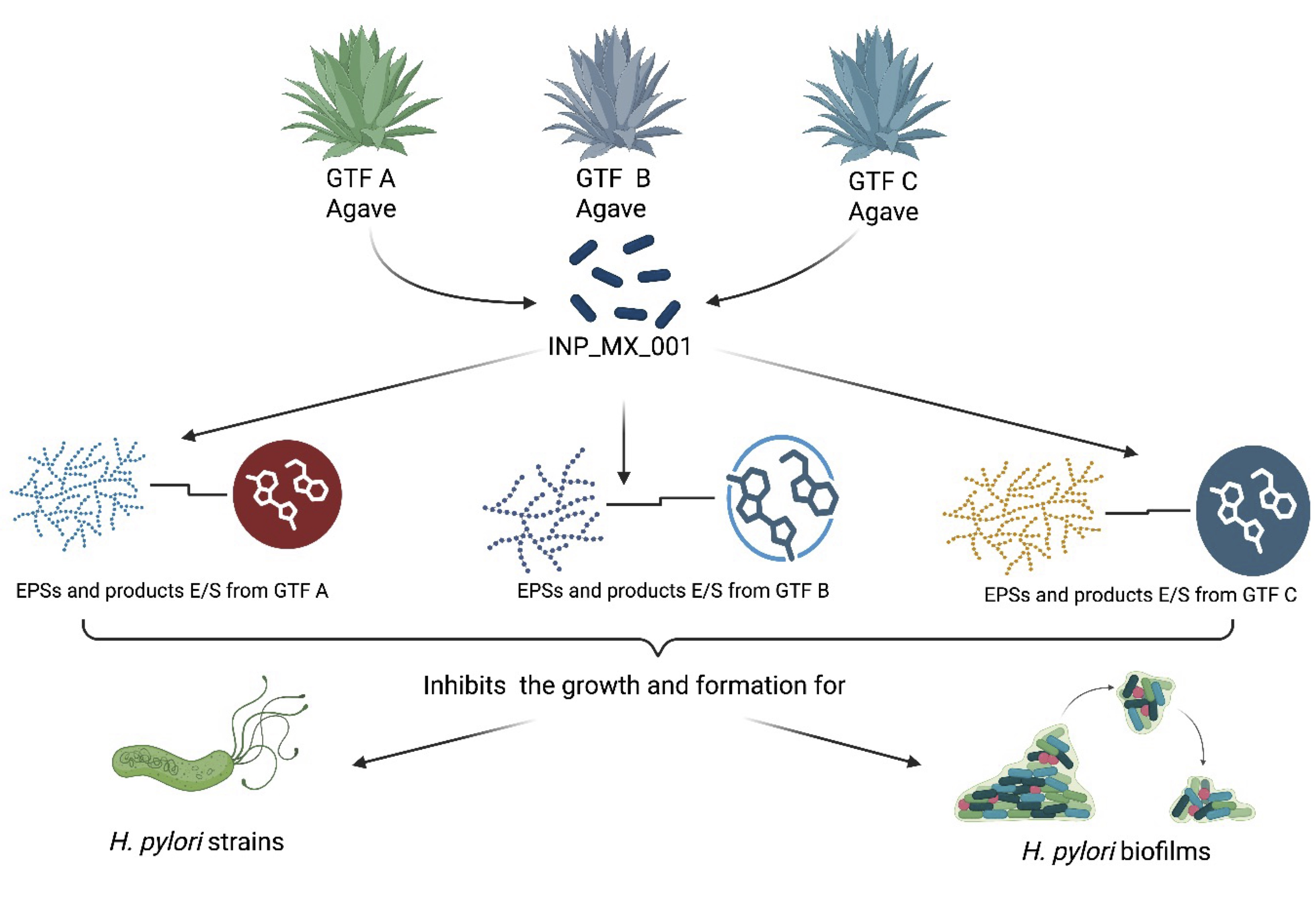Sanhueza-Carrera, E.A.; Hernández-Delgado, N.C.; Romo-González, C.; Castro-De la Mora, C.; Mendoza-Camacho, C.; Fernández-Lainez, C.; López-Velázquez, G. Agave Fructans as a Carbon Source to Develop a Postbiotic-Based Strategy for the Prophylaxis and Treatment of Helicobacter pylori Infection. Int. J. Mol. Sci. 2025, 26, 11119. https://doi.org/10.3390/ijms262211119