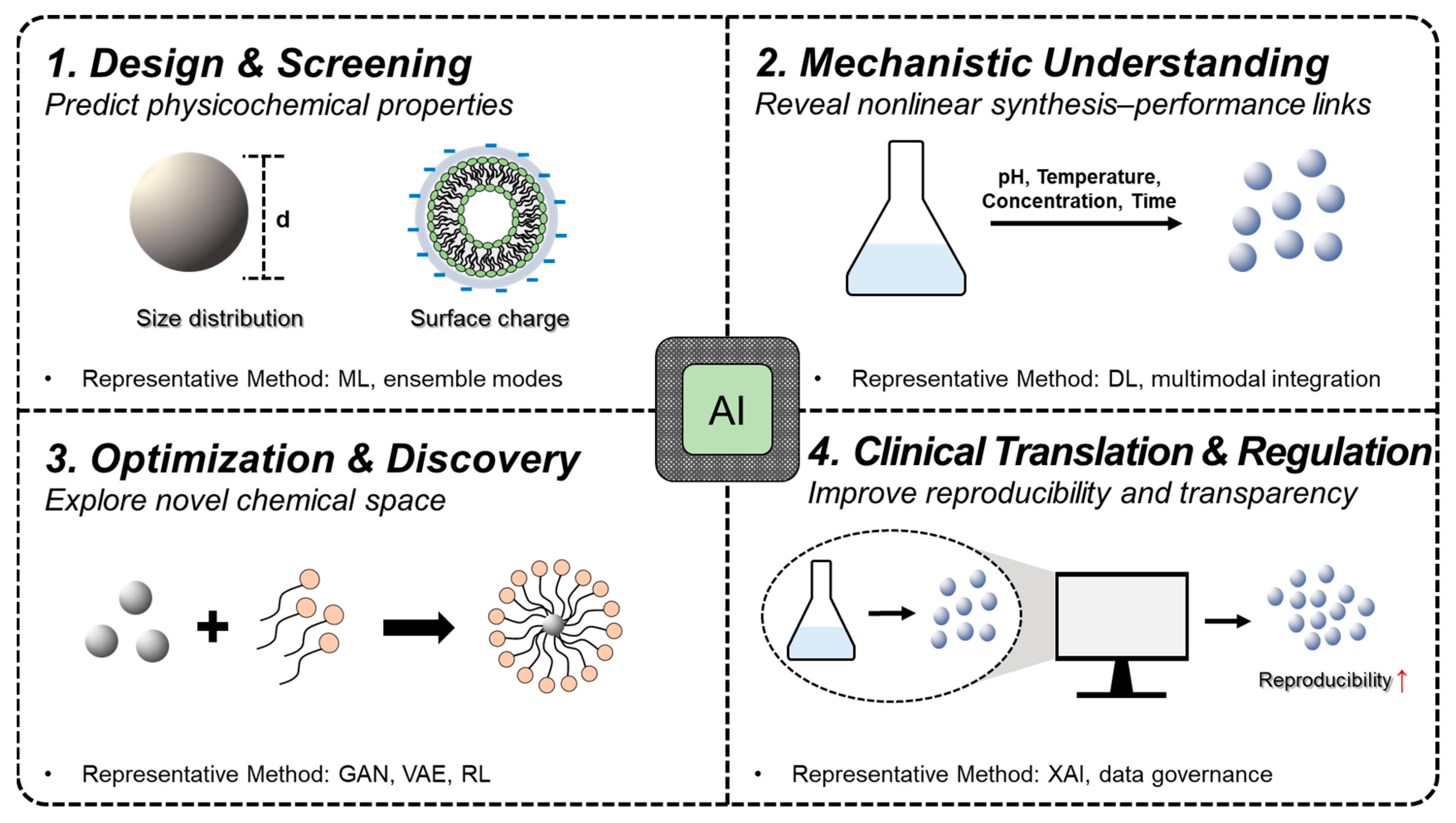 | Design & Screening | Predict nanocarrier physicochemical properties | ML, ensemble models | NanoCommons | Efficient candidate ranking |