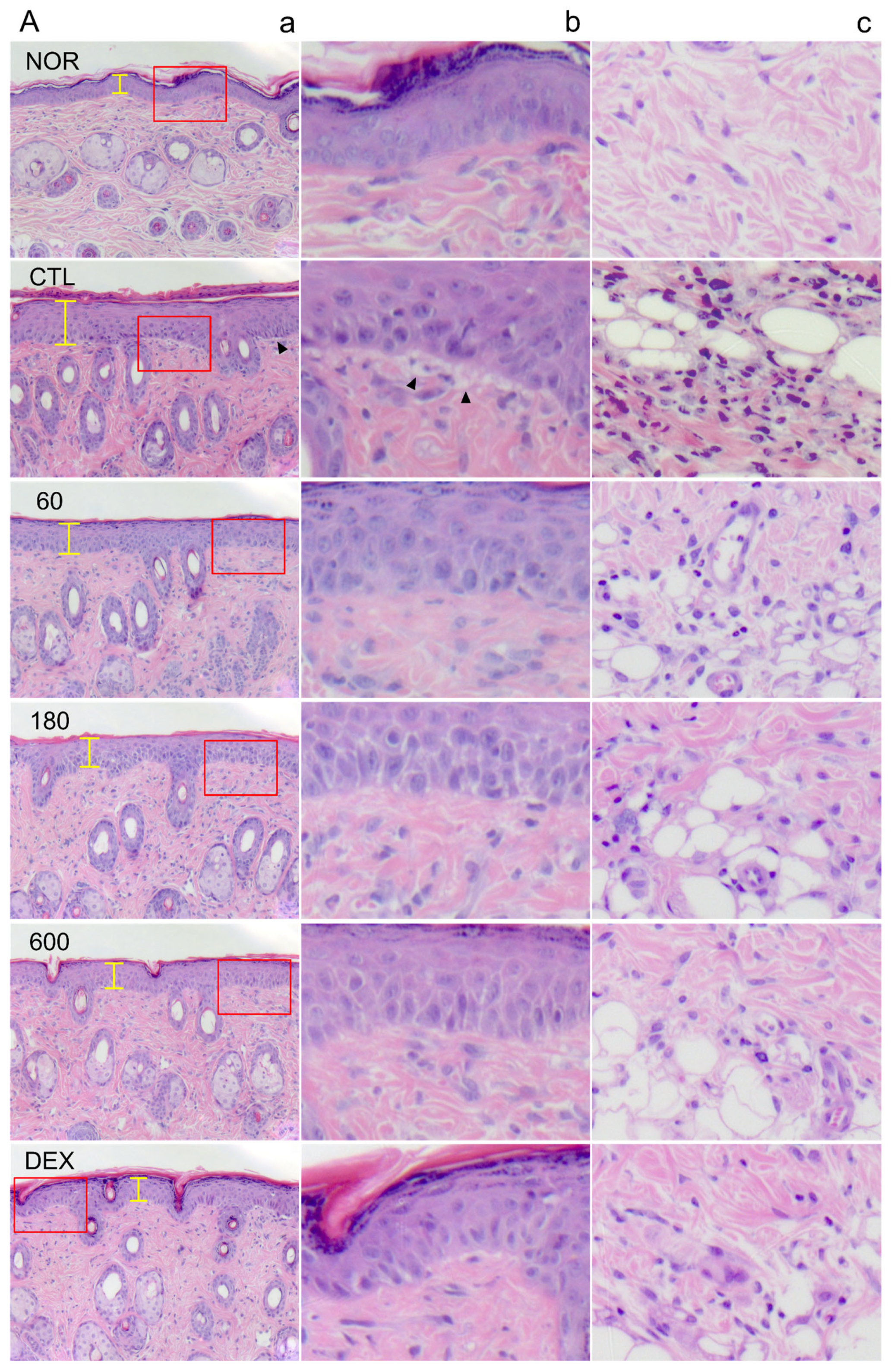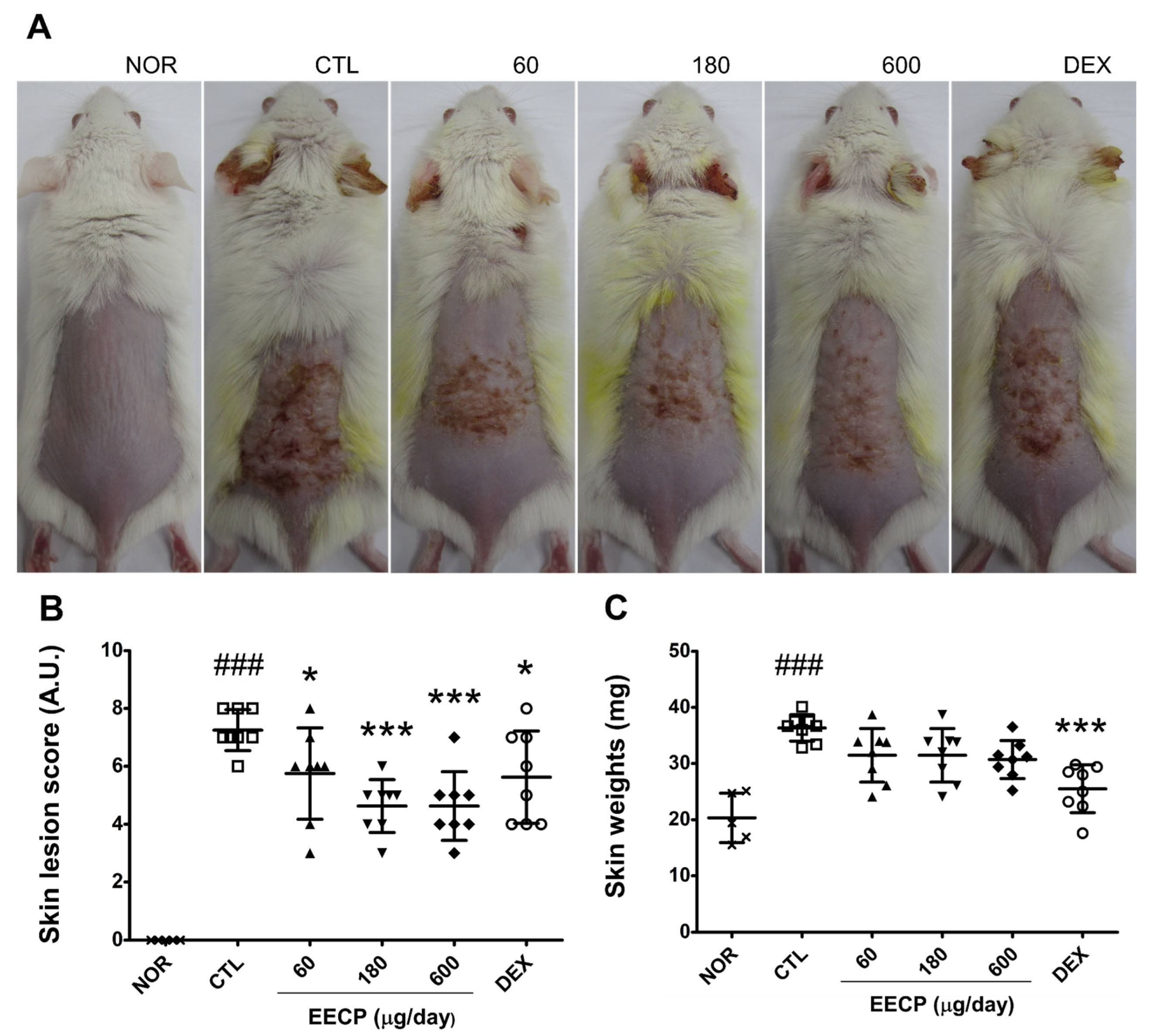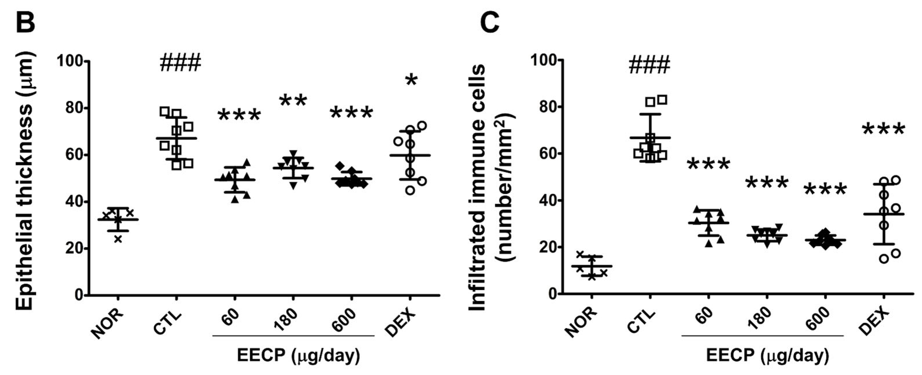 2.4. EECP Effectively Inhibited Epidermal Hyperplasia and Immune Cell Infiltration of Inflamed Tissues
