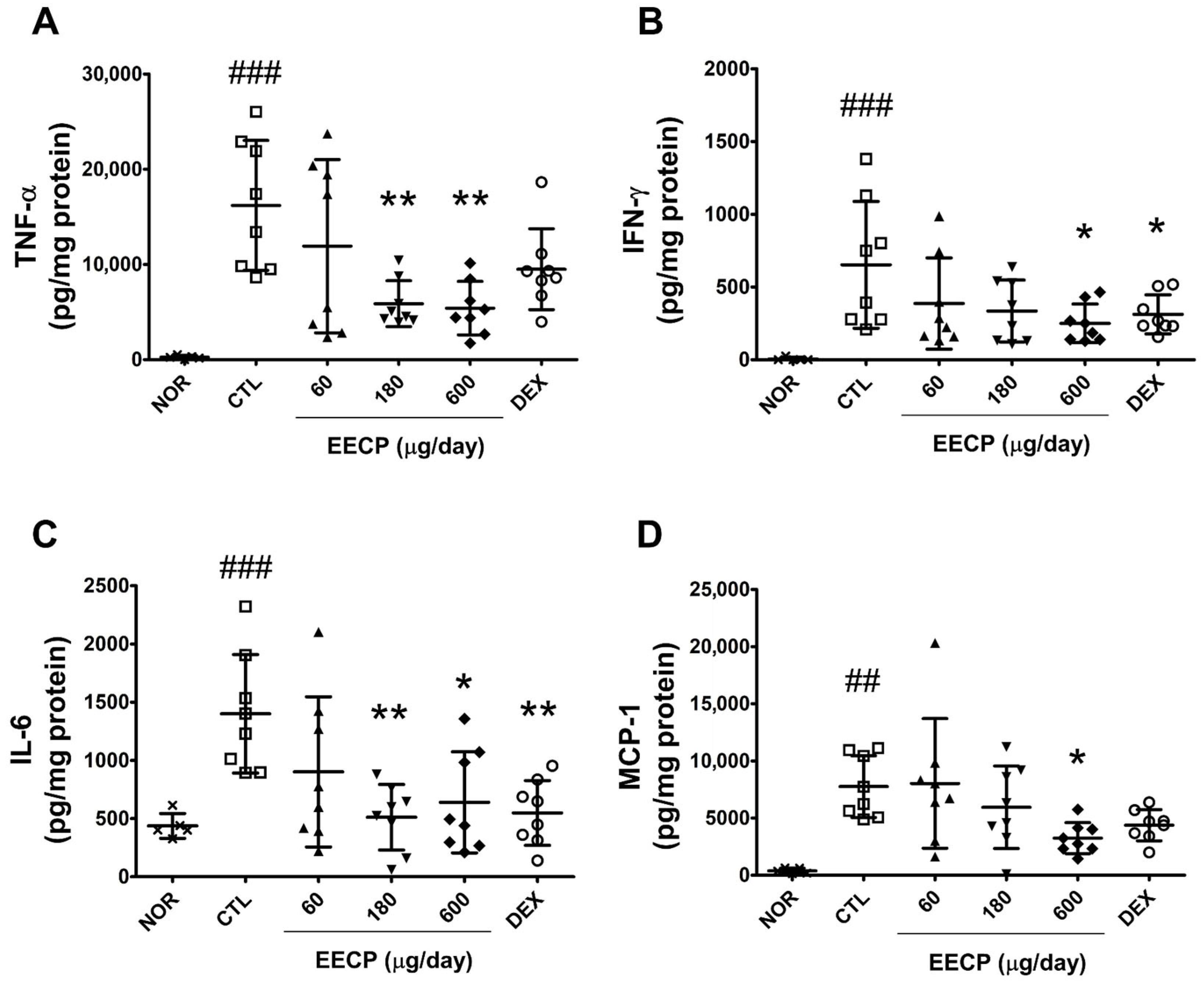 2.5. EECP Reduced the Production of TNF-α, IFN-γ, IL-6 and MCP-1 in Inflamed Tissues