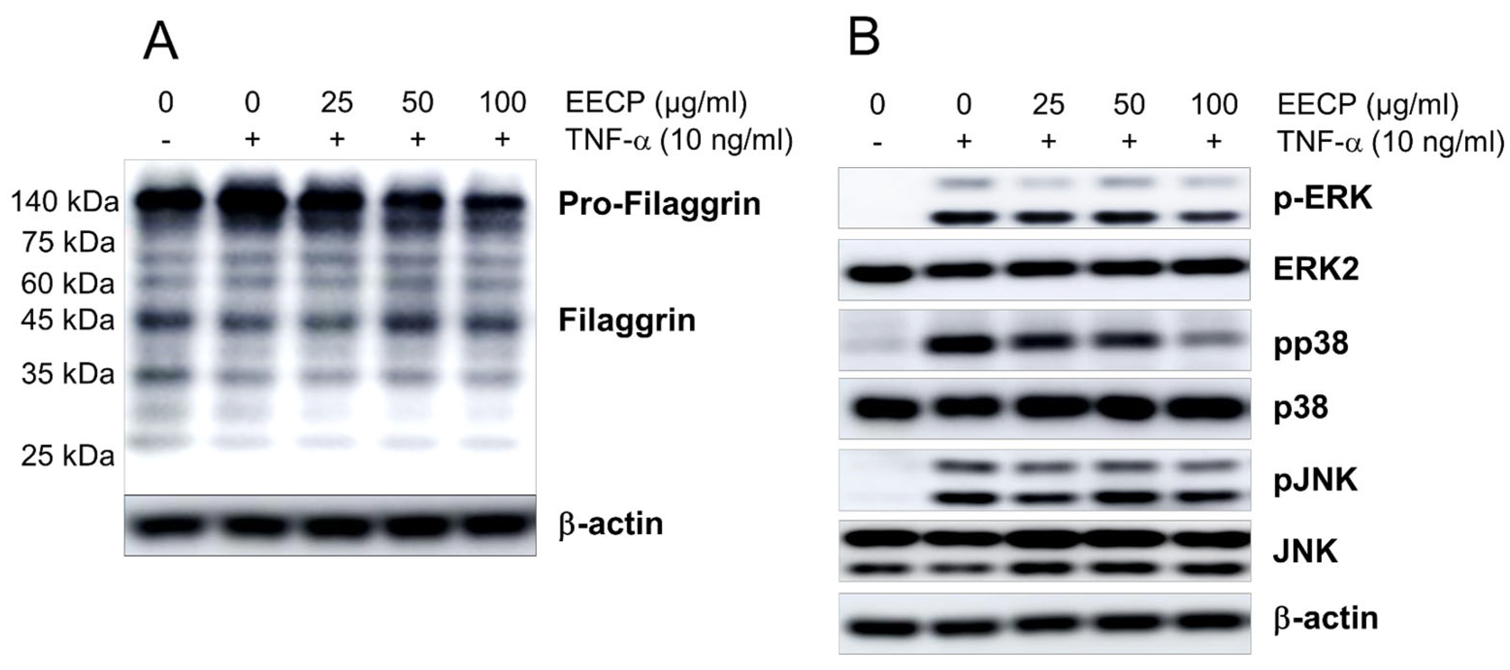 2.6. EECP Inhibited TNF-Induced Pro-Filaggrin Accumulation and Phosphorylations of ERK and P38, and Restored Filaggrin Expression in HaCaT Cells