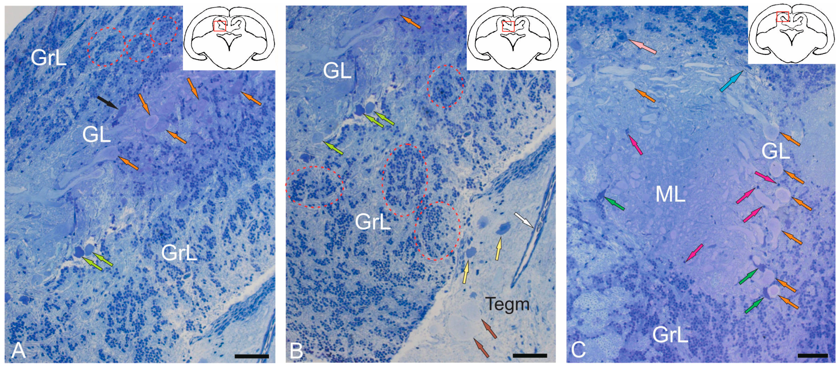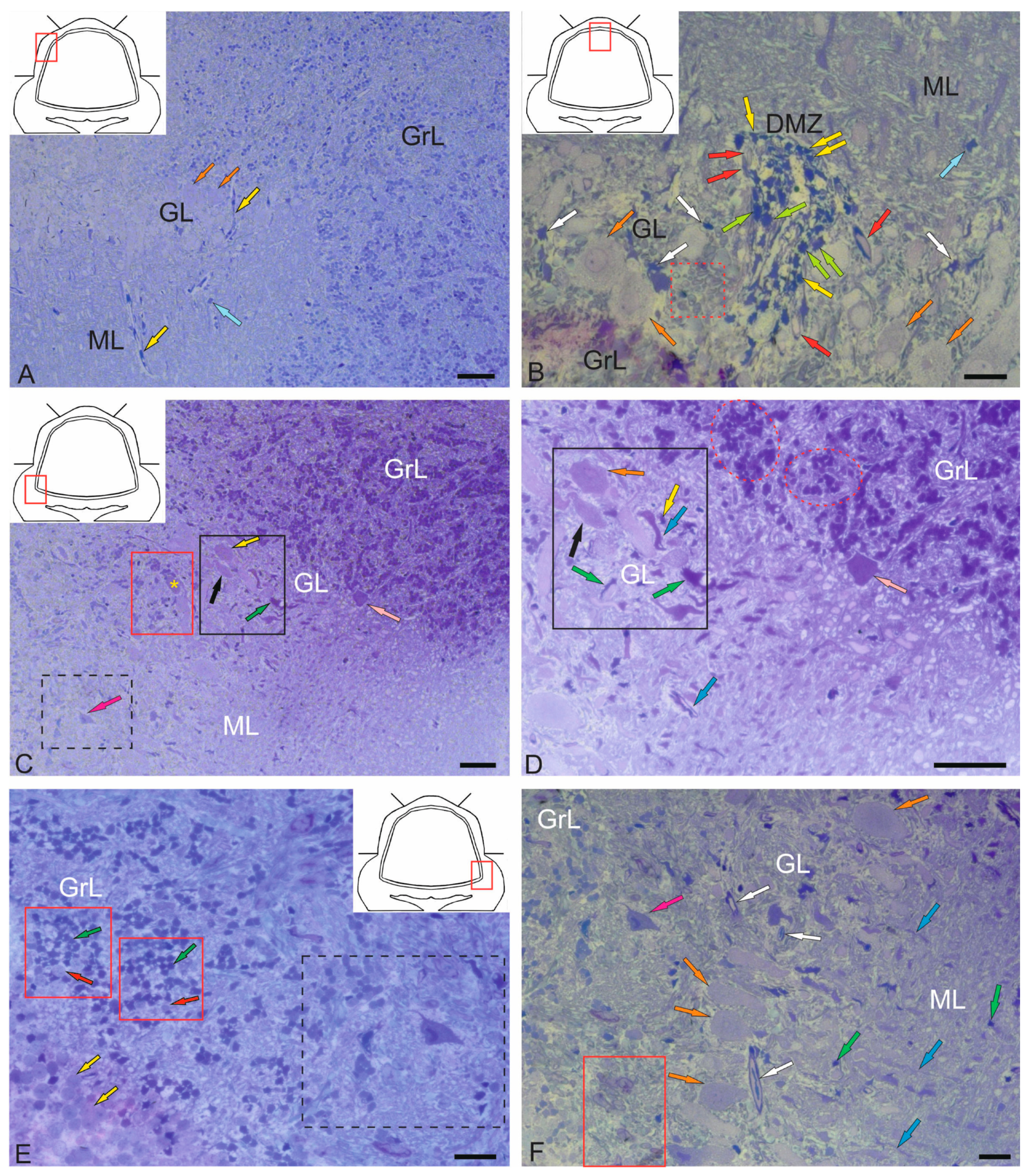 Granular eminences (GrEm) were located in the ventrolateral zone from the CC of juvenile chum salmon and included a centrally located GrL and a peripherally positioned ML (Figure 3A). The organization of GrEm was largely similar to that of the CC (Figure 3B). However, clusters of GrCs were smaller and were represented mainly in the CC (Figure 3B, red dotted ovals), fibers (Figure 3A, green arrows), macroglial cells (Figure 3A, scarlet arrows) and Golgi cells (Figure 3A,B, pink arrows), which were quite common. In general, the distribution density of granular cells in the GrEm was lower than in the CC. Along with small clusters, a diffuse type of distribution of GrCs predominated.