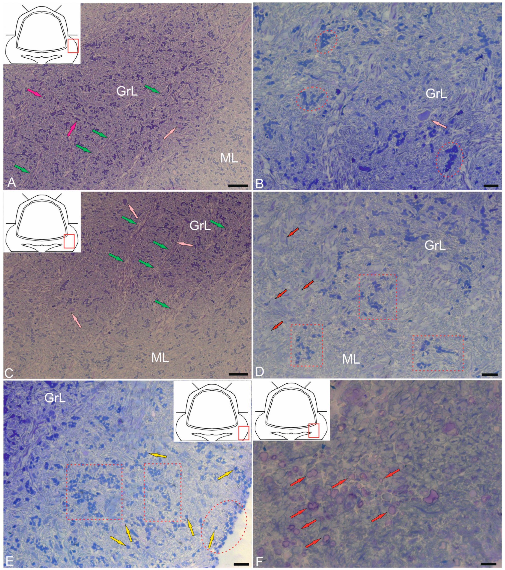 In the ventrolateral zone of the GrEm, at the border of the ML and Gl, fibers of different directions were observed, representing the lateral cerebellar peduncles (Figure 3C, green arrows). GCs of various sizes were frequently encountered (Figure 3C, pink arrows); their morphometric parameters are presented in Table 1. Small clusters with densely stained dendritic aNSPCs were found at the border of the molecular and granular layers (Figure 3D, in red dotted rectangles). Another population was represented by rounded, transparent, weakly stained cells corresponding to the non-glial type of aNSPCs (Figure 3D, red arrows).