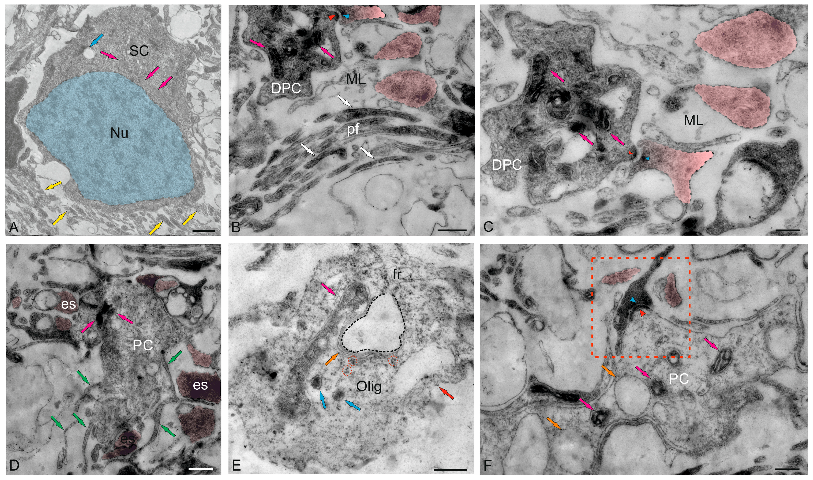 In the GL, astrocytes were found adjacent to the EDCs (Figure 13E, yellow arrow). In contrast to other described forms of astrocytes found in the juvenile chum salmon cerebellum, these astrocytes clearly had two nuclei (Figure 13F, arrowheads). This astrocyte type morphologically resembled astrocytes with incomplete division. We suggest that this pattern arose from asymmetric mitoses in which cytoplasmic division was not completed. Typical end-feet were identified in these protoplasmic astrocytes (Figure 13F, orange arrowheads). Interestingly, local, as well as larger, areas containing secretory granules of unknown origin were identified in the GL (Figure 13E, red dotted ovals). We speculate that these granules may contain metabolic extracellular glutamate excreted by pfs.