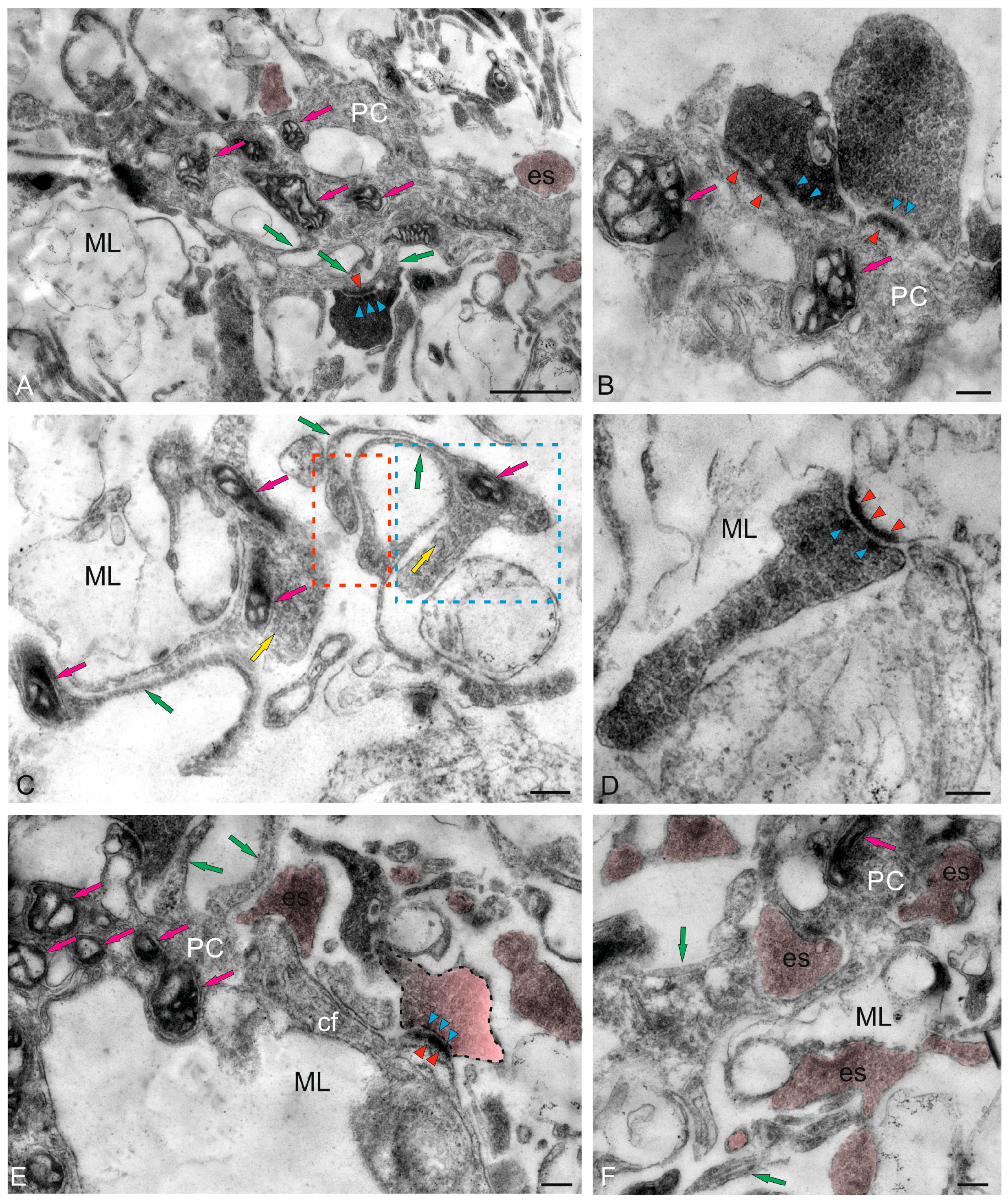 Synaptic structures with complex, convoluted T-shaped morphology, containing individual mitochondria, were identified within the dendritic bouquets of PCs and EDCs (Figure 5C). Such structures had large synaptic terminals of complex shapes, containing mitochondria that were often connected via fibers to smaller club-shaped endings (Figure 5C). The presence of vesicles with neurotransmitter could be traced in all types of synaptic structures contained in climbing fibers (cfs) (Figure 5C, yellow arrows). Single, elongated terminals, 1.3 μm in size, with pre- and postsynaptic structure were identified (Figure 5D). The presence of numerous synaptic terminals, with a high density distribution in the ML, converging on cfs (Figure 5E) and forming contacts in the extracellular space of ML (Figure 5F), indicates a significant complexity of the synaptic structure regulating the cerebellar impulse in the molecular layer and a complex pattern of synaptic connectivity in the juvenile chum salmon cerebellum.