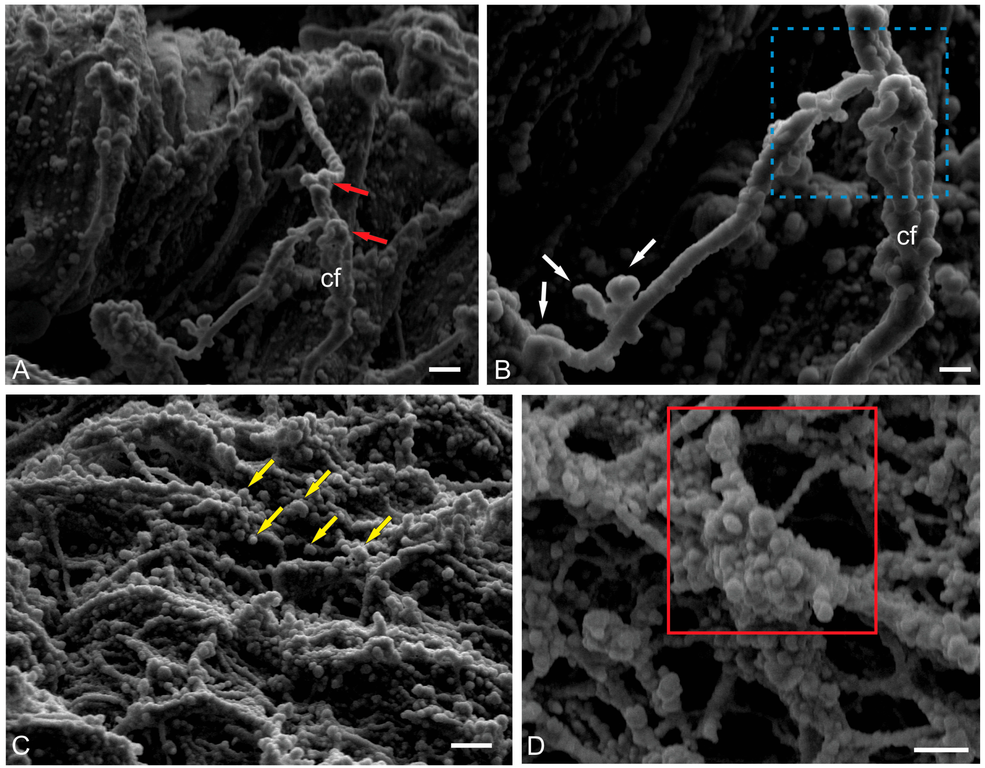 A scanning electron microscopy (SEM) study of the ML of juvenile chum salmon revealed a complex and branched structure of liana-like afferents with varicose dilatations and terminal thickenings (Figure 6A). An individual cfs has an uneven thickness, and thickenings of different volumes are observed at the branching sites (Figure 6B). In general, the surface over which cfs spread in the cerebellum also has a complex and heterogeneous relief, including numerous synaptic structures (Figure 6C). When magnified, these synaptic areas have an appearance of a multidimensional network with numerous spherical thickenings (Figure 6D).