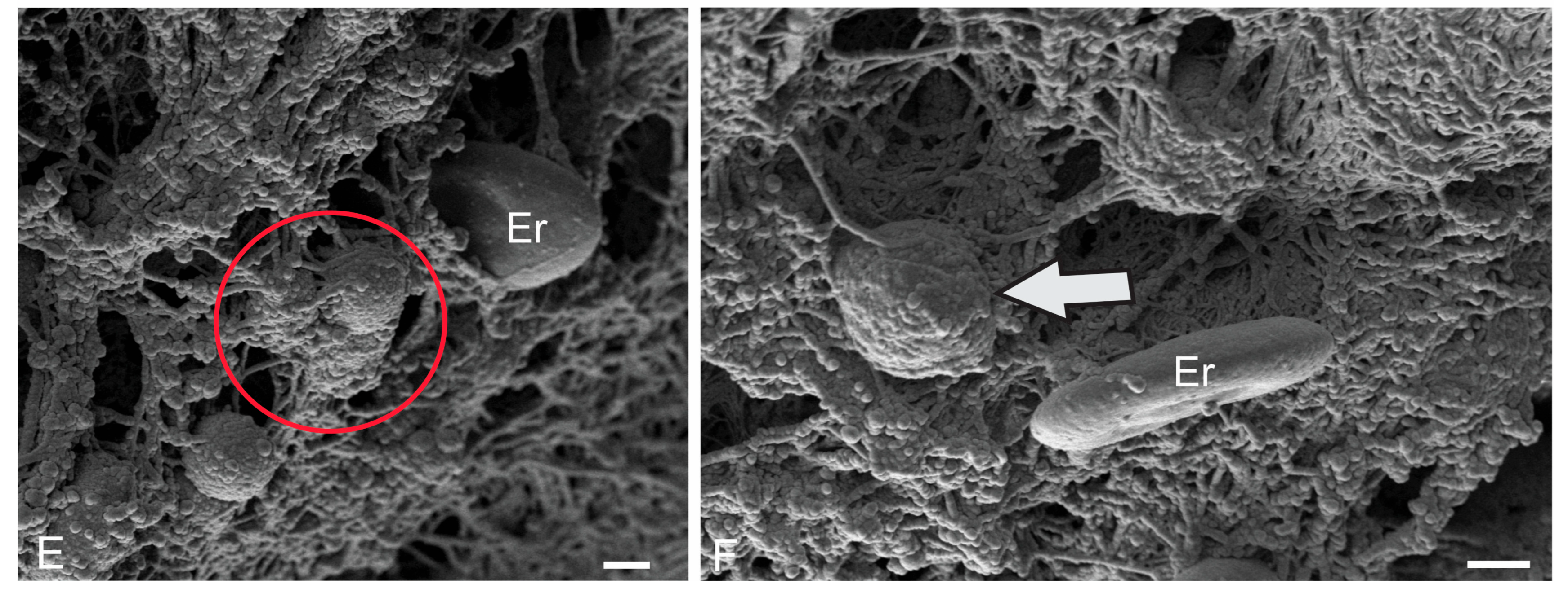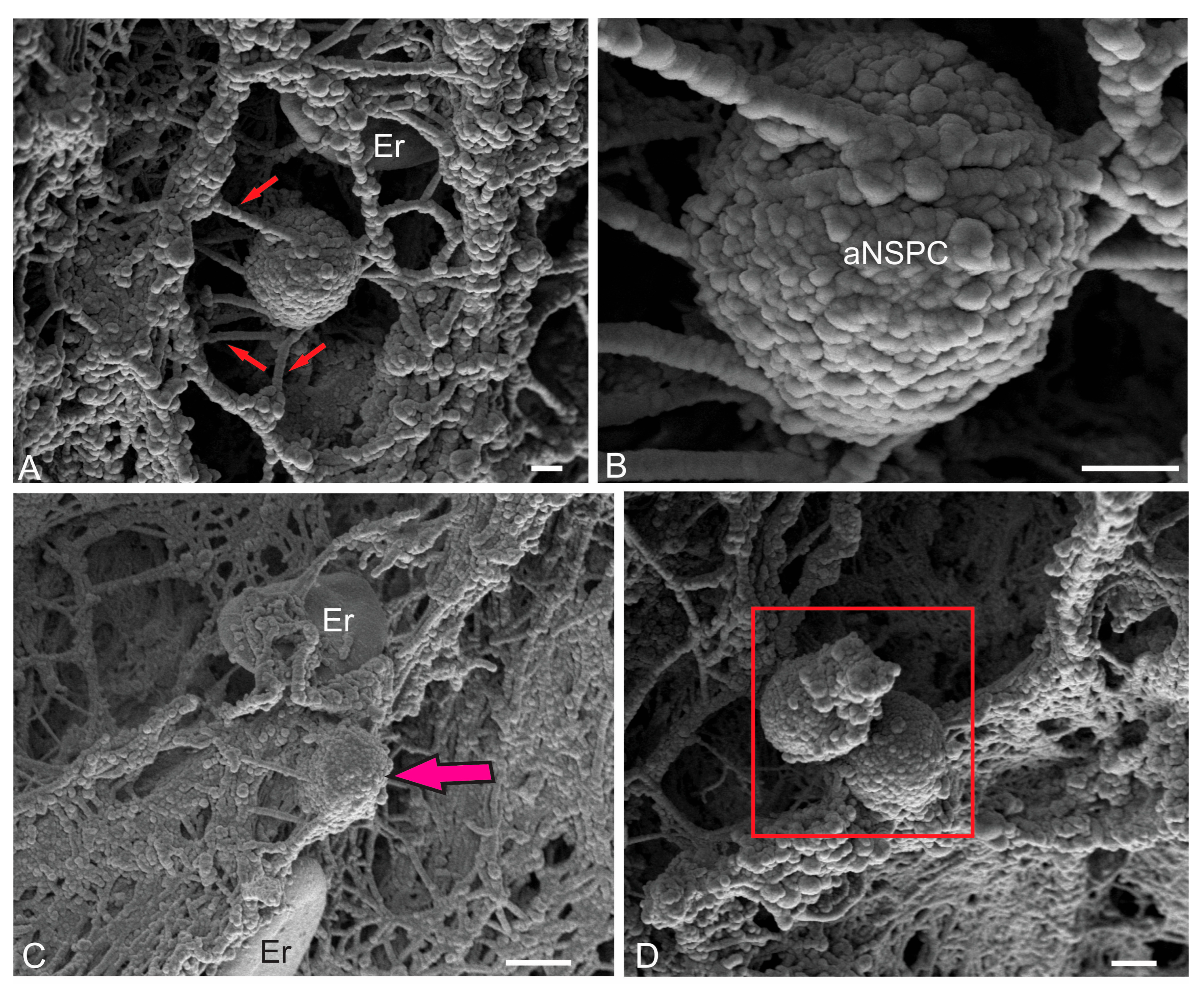 Spherical cells, identified in the superficial dorsolateral regions of the ML, were other objects for stereoscopic ultrastructural study. Previously, we showed that in the trout O. mykiss [14], masu salmon O. masou [13,15], and chum salmon O. keta [16], such cells are labeled with PCNA and also contain vimentin and nestin [14,16], i.e., they are aNSPCs. SEM was used to detail their spatial ultrastructure. The results of the study showed that these cells are often located near erythrocytes and are fixed on the surface of the ML by microfibrils (Figure 7A). The surface microcytosculpture of such cells was heterogeneous and had a bumpy relief (Figure 7B). Surrounded by the extracellular matrix of the pial membrane, aNSPCs were often adjacent to biconcave erythrocytes with a smooth surface (Figure 7C). As a result of proliferation, aNSPCs often formed paired cell clusters (Figure 7D). In some cases, small clusters with several aNSPCs were identified (Figure 7E). Diffuse patterns of NSC distribution often demonstrated their association with the surface matrix, as well as erythrocytes (Figure 7F). Overall, the SEM data suggest that spherical cells with a superficial localization in the body of the cerebellum can be classified as aNSPCs.