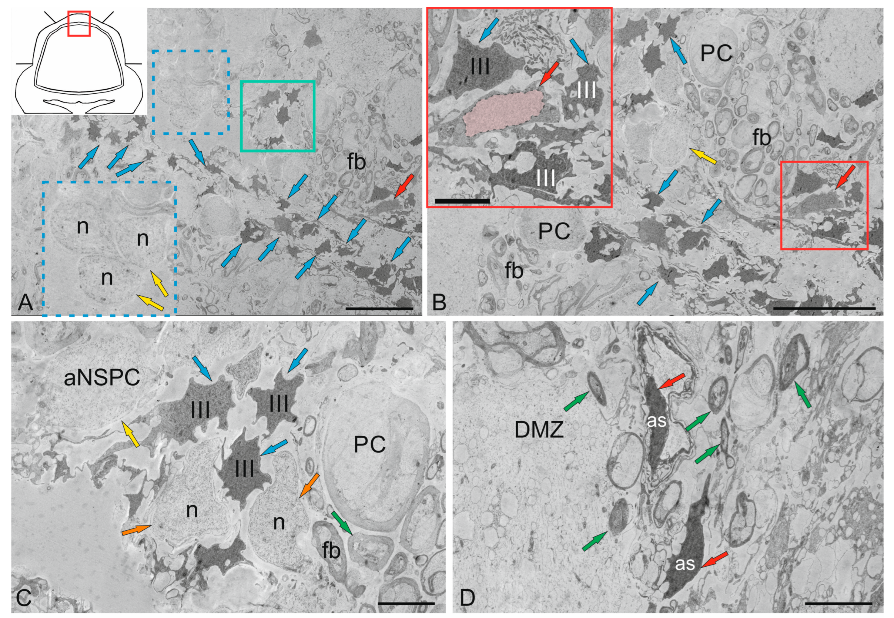 The third type was numerous darkly stained, stellate-shaped glial aNSPCs, occupying the central part of the DMZ (Figure 8A,B). This population of aNSPCs was heterogeneous and was represented by small cells and larger types of progenitors (Table 1). According to the classification of Lindsey and colleagues [34], these aNSPCs corresponded to type III, had electron-dense cytoplasm, a large, irregularly shaped nucleus, and short processes (Figure 8B). Type III cells formed clusters in the peripheral areas of the DMZ (Figure 8C), where they were adjacent to young neurons and/or neuroblasts. Elongated, large cells with bipolar morphology, corresponding to pericytes or astrocytes (Figure 8D), surrounded by numerous myelinated fibers, were identified in the DMZ.