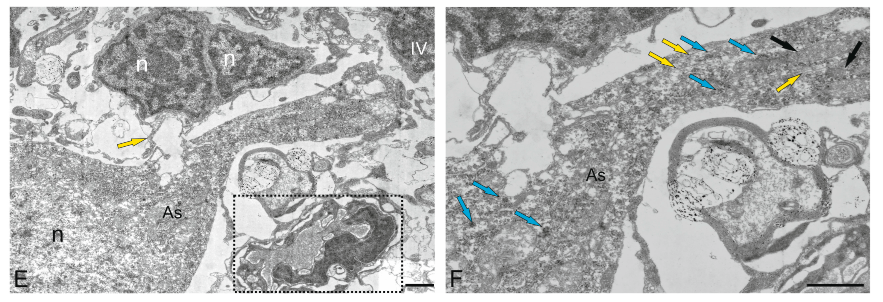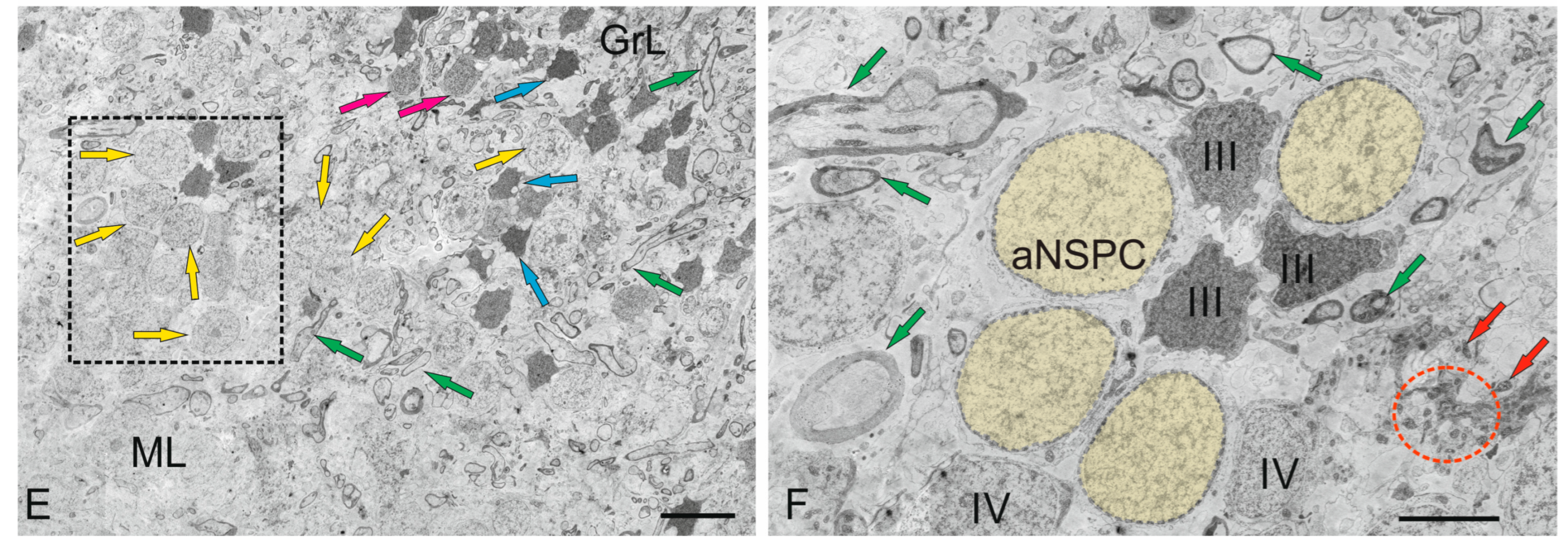 Large protoplasmic astrocytes with soma dimensions of 13.9 by 9.6 μm and nuclei measuring 11.3 by 8.4 μm (greater and lesser diameters, respectively) were also found in the GrL (Figure 11D). These cells had dense cytoplasm with few vacuoles located at the periphery and a large, centrally located nucleus (Figure 11D). Unlike GCs, the astrocyte nucleus was poorly delineated and contained a nucleolus and clumped heterochromatin (Figure 11D). The dense cytoplasm of the astrocyte contained numerous ribosomes on RER cisterns (Figure 11D); mitochondria, on the contrary, were sparse. Thick processes were identified in the astrocyte, and some of them could be traced over a considerable distance (Figure 11E). Astrocyte processes formed contacts with type IV aNSPCs (Figure 11E). Apoptotic patterns of granule cell, in the form of end bodies, were detected near the astrocyte (Figure 11D,E). The intercellular space of the GSs contained numerous granules and sprouting fibers, and was significantly depleted of cells compared to other areas of the GSs (Figure 11D). The astrocyte cytoplasm was filled with ribosomal complexes and was distinguished by a high electron density. Actin fibers, polyribosomal complexes, and electron-lucent mitochondria could be seen in the astrocyte processes (Figure 11E). Signs of destruction were visible in the area of the supposed contact between the astrocyte and aNSPCs (Figure 11E).