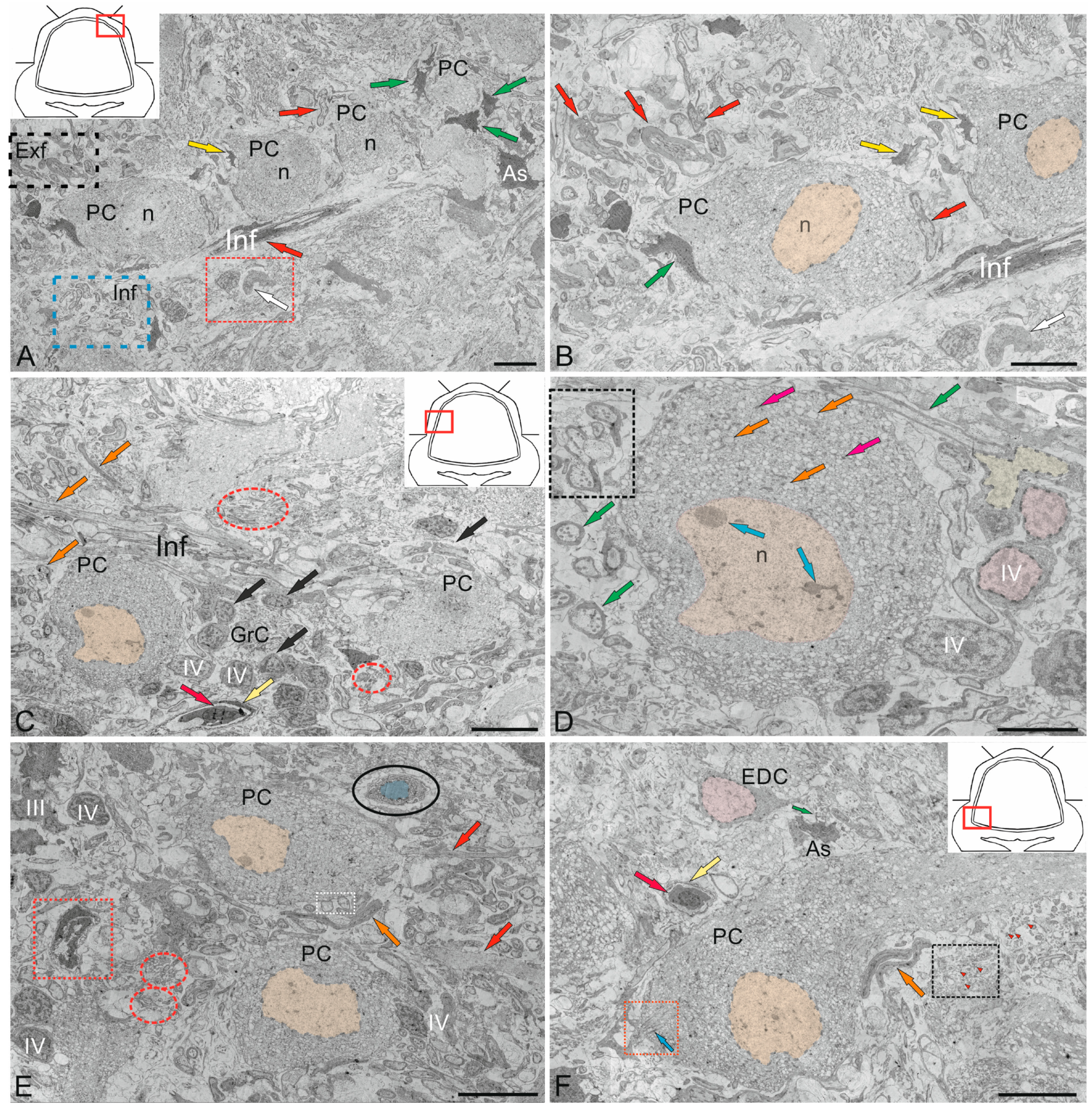 Figure 9. Ultrastructural organization of the ganglionic layer of the cerebellum in juvenile chum salmon, Oncorhynchus keta. (A)—General view of the ganglionic layer (GL) formed by Purkinje cells (PCs); PCs nuclei (n); fibers above the GL form the extraganglionic plexus (Exf, in the black dotted rectangle); fibers below the GL form the infraganglionic plexus (Inf, in the blue dotted rectangle); fragments of apoptotic bodies (white arrow) are outlined by the red dotted rectangle; astrocytes (As) of the protoplasmic type are indicated by green arrows; microgliocyte, by yellow arrow; infraganglionic fibers, by red arrows. (B)—Enlarged fragment of the GL; PCs nuclei (n) are highlighted in yellow; other designations are as in (A). (C)—GL neurons from the lateral area are ectopic in the GrL and are surrounded by type IV granular cells (black arrows); Inf fibers are indicated by orange arrows; areas with secretory granules and fibers are outlined by red dotted ovals; a vessel (yellow arrow) with an agranular macrophage is indicated by a red arrow. (D)—An enlarged fragment of GL in the lateral zone; nucleoli in the nucleus (n) of the PC are indicated by blue arrows; vacuoles, by orange arrows; mitochondria, by crimson arrows; fibers, by green arrows; aNSPCs type IV nuclei are highlighted in pink; a mitotically dividing nucleus IV, in yellow; a fragment containing fibers with mitochondria is outlined with a black dotted rectangle. (E)—Contacts of the PC with electrotonic-type fibers on the PC bodies (outlined by a white dotted rectangle), endings of cfs (orange arrows), a granulocyte (in a black oval) with large vacuoles in dense cytoplasm and a homogeneous nucleus (highlighted in blue); fragments of unbranched PC dendrites are indicated by red arrows; patterns of sprouting fibers, by red dotted ovals; patterns of apoptosis are outlined by a red dotted rectangle; type III aNSPCs—III; type IV aNSPCs—IV. (F)—GL neurons from the ventrolateral region: the nucleus of the ML is highlighted in yellow; the axonal hillock containing actin filaments is outlined by red dotted square (blue arrow); cf endings on the PC body are indicated by orange arrows; secretory granules are outlined by black dotted rectangle (red arrowheads); a eurydendroid cell (EDC) with an irregularly shaped nucleus (highlighted in pink); the vessel with an agranular macrophage is indicated by the yellow arrow (red arrow); an astrocyte (As) phagocytic vesicle with glutamate, by green arrow. TEM. Scale bars: (AC,E,F)—10 µm; (D)—5 µm.