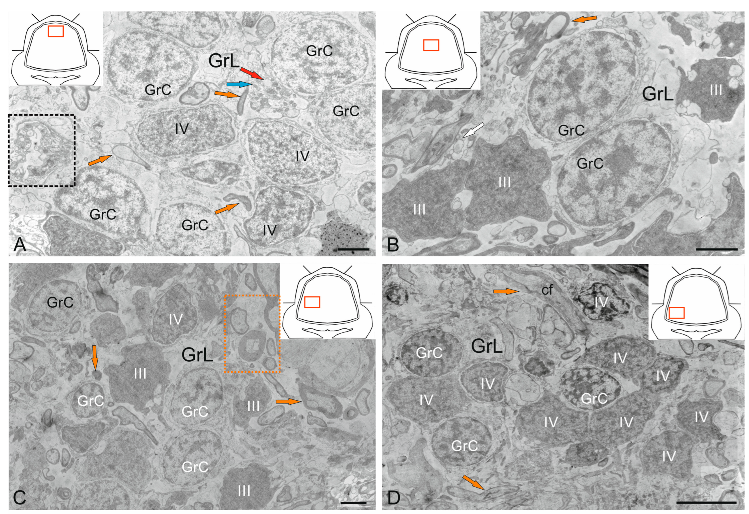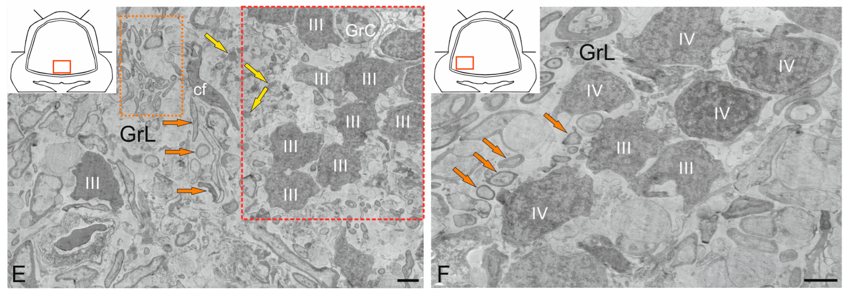 The GrL is the deepest layer of the cerebellum, located ventrally to the GL. Several cell types were found in the GrL of the cerebellum: small granular cells (GrCs) and large Golgi cells (GCs) (Figure 10A–F and Figure 11A–C). Ultrastructural analysis of the GrCs of the cerebellum showed differences in the morphological structure of GrCs, which formed a heterogeneous group of aNSPCs, as well as glutamatergic neurons, which formed pfs branching in a T-shape in the ML.